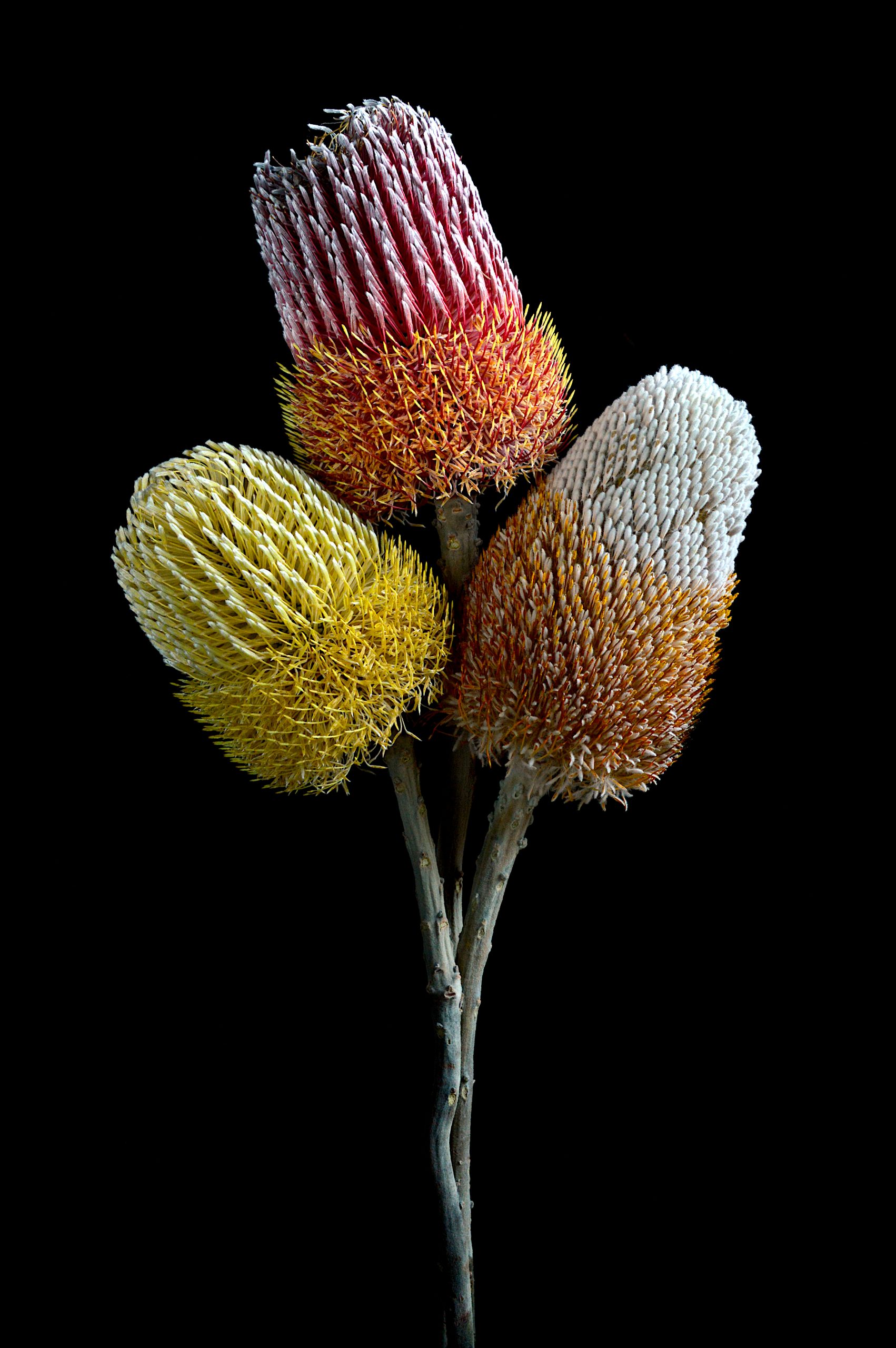 Three Banksia flowers in beautiful vibrant colour and incredible detail – the crucial ingredients that grab my attention for the perfect still life.