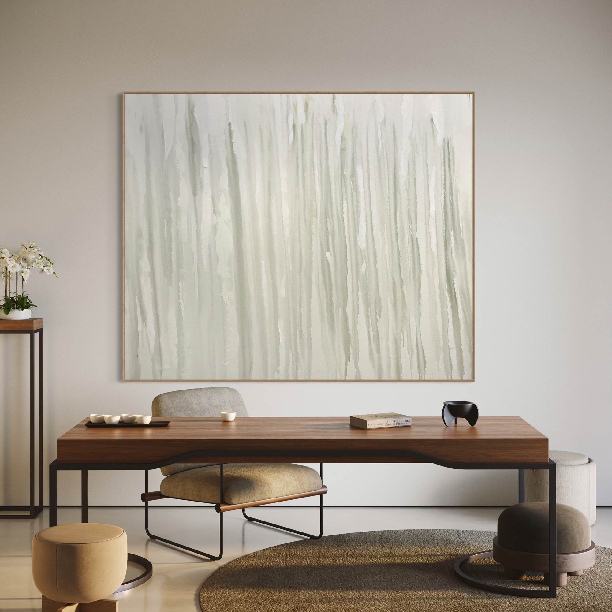 This contemporary abstract painting features complex mark making and subtle texture. The beautifully balanced, muted palette of warm beige, white, cool greys and cloud dancer tones creates a calm and neutral piece. The imagery extends around the edges of the canvas, offering a seamless presentation, should you choose to hang it without a decorative frame.