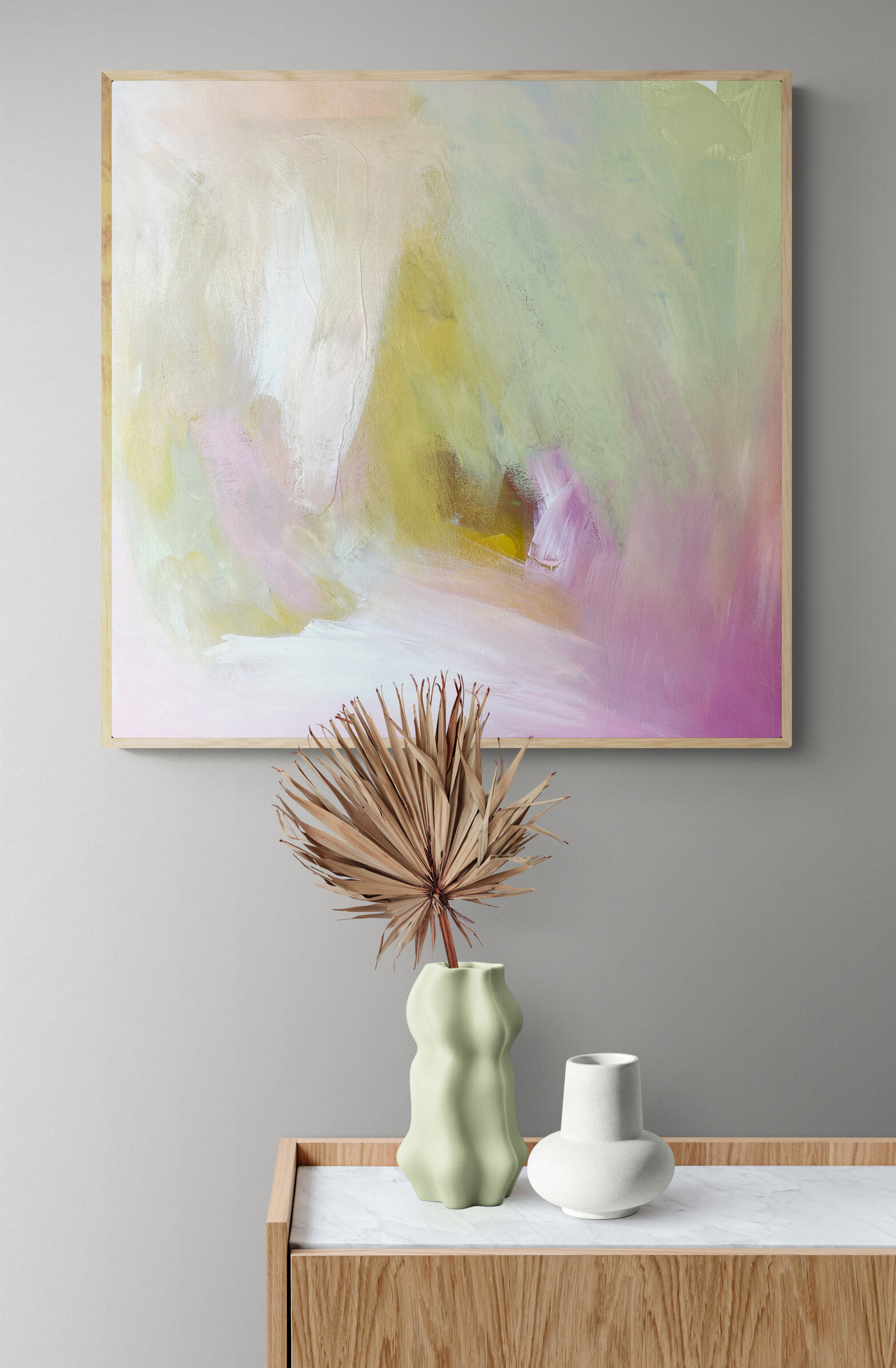 This captivating artwork has been created from a delightful combination of intuitive mark-making and a striking palette of light pink with just a hint of hot pink, olive, grey and white.