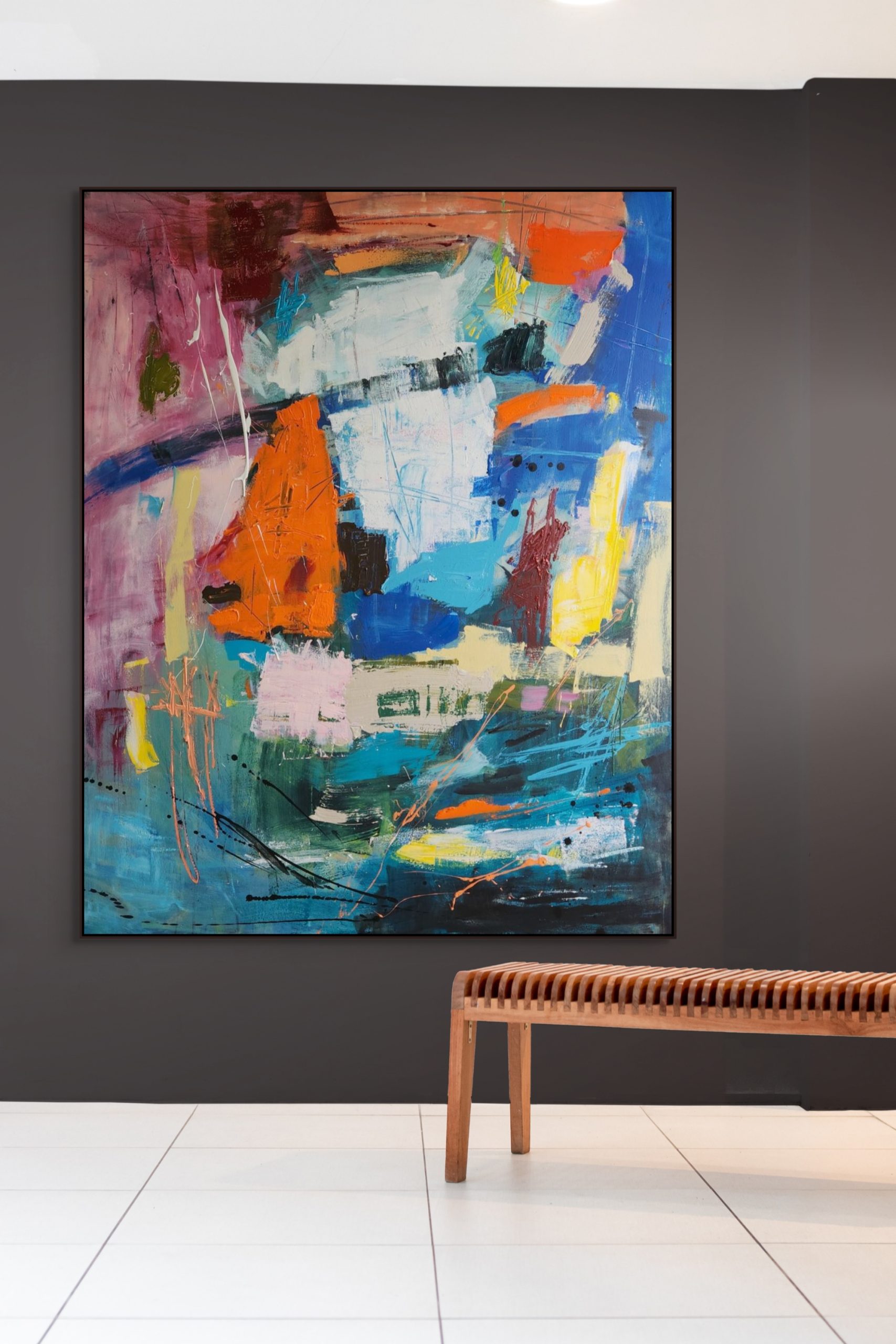 This modern piece was created with acrylic paint and oil sticks. It was sprayed with varnish for a protection of colour.
