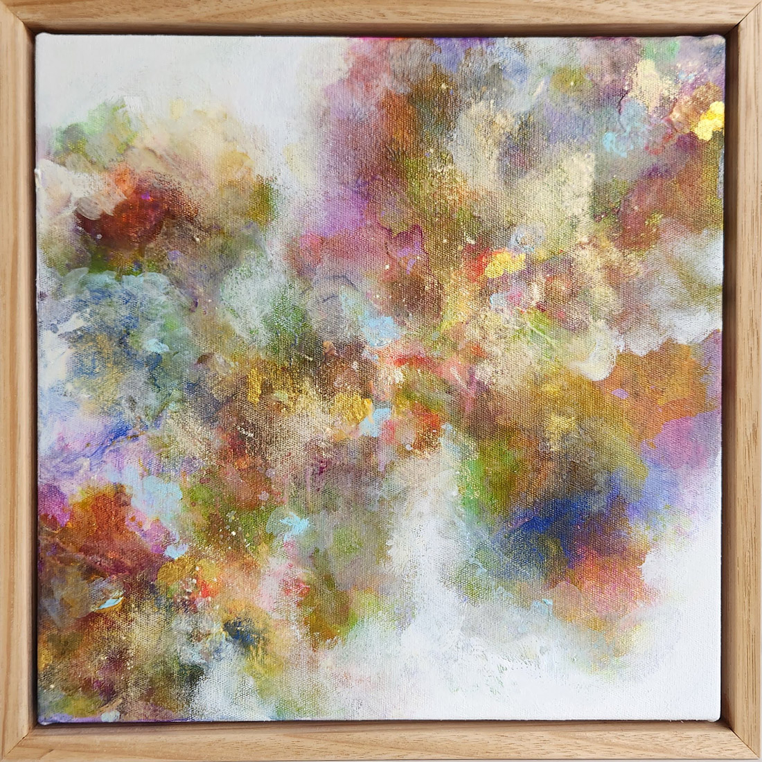‘Running through the flower fields’Â by Fern Siebler is a muted mini artwork featuring dreamy tones of mauve, blue, gold, green. This piece can stand freely, such as on an entry way sideboard or desk, or be hung on your wall.