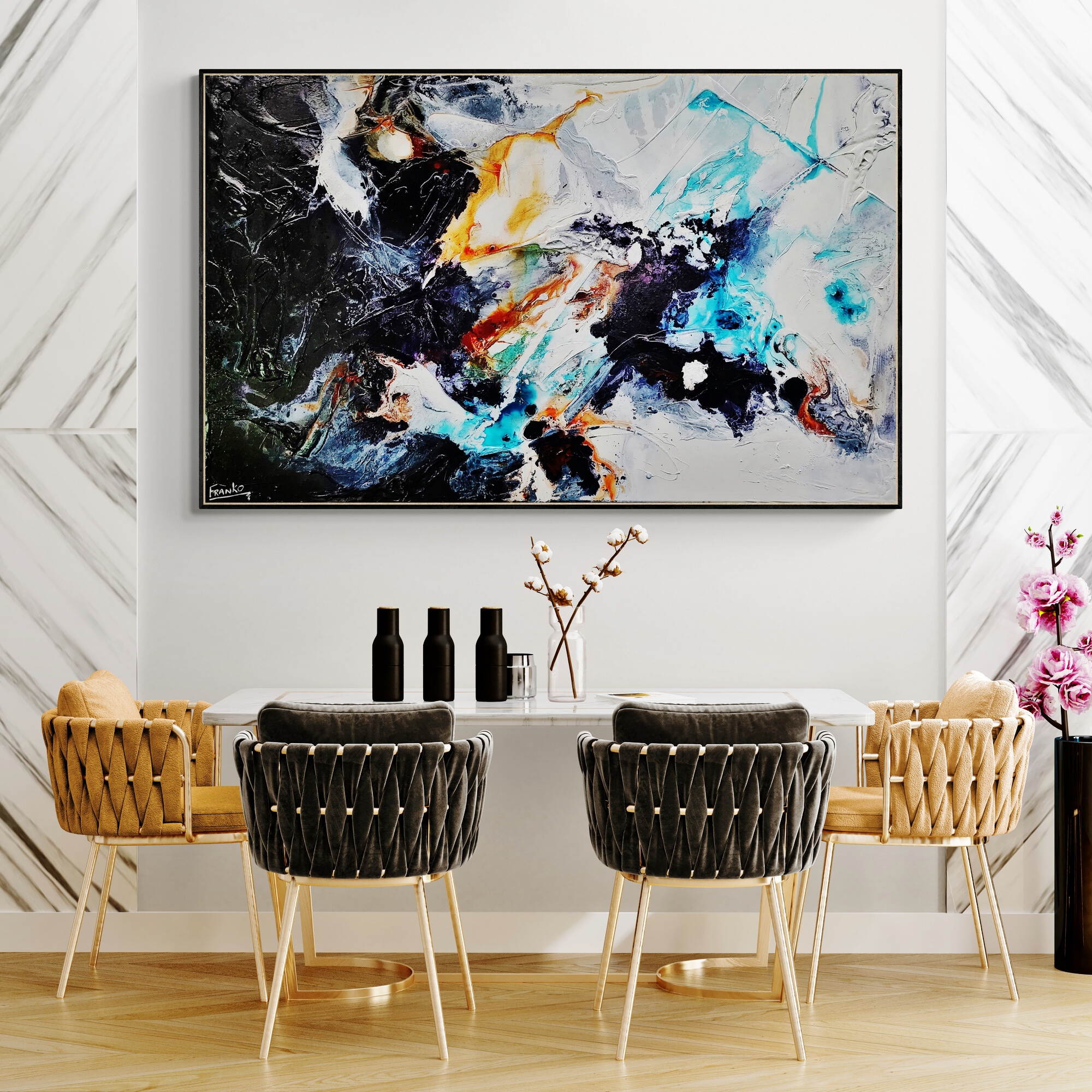 Provided with listings are some insitu images. We strive to ensure they are accurate in scale. Sometimes we will add an external frame to the painting insitu, to provide a vibe for how that would look also. As mentioned above, my pieces arrive ready to install with gallery finished edges and honestly, most people don’t add external framing. However, it is of course an option. If you have any questions, please let me know. We are here to help and want to make it as easy as possible for you if your décor aspirations require it.