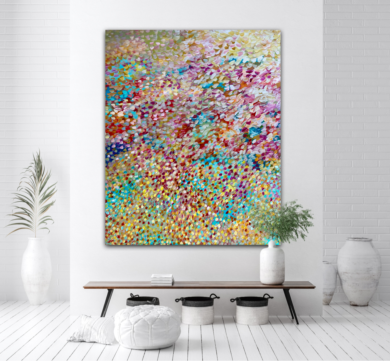Sacred Garden by Theo Papathomas a painting with soft colours of the petals flying in the wind creating this beautiful carpet of petals in the landscape with lots of layers of paint. Beautiful flickering petals dancing over the land shining like stars. Petals weeping onto the landscape creating this veil of petals covering the landscape in as of pastel colours . A composition of colours and rhythms of petals dancing like musical notes over the land . A very peaceful and tranquil painting with so much depth. The painting does not come with an external frame.The painting is signed and dated 2021 at the back and comes with a certificate of Authenticity.