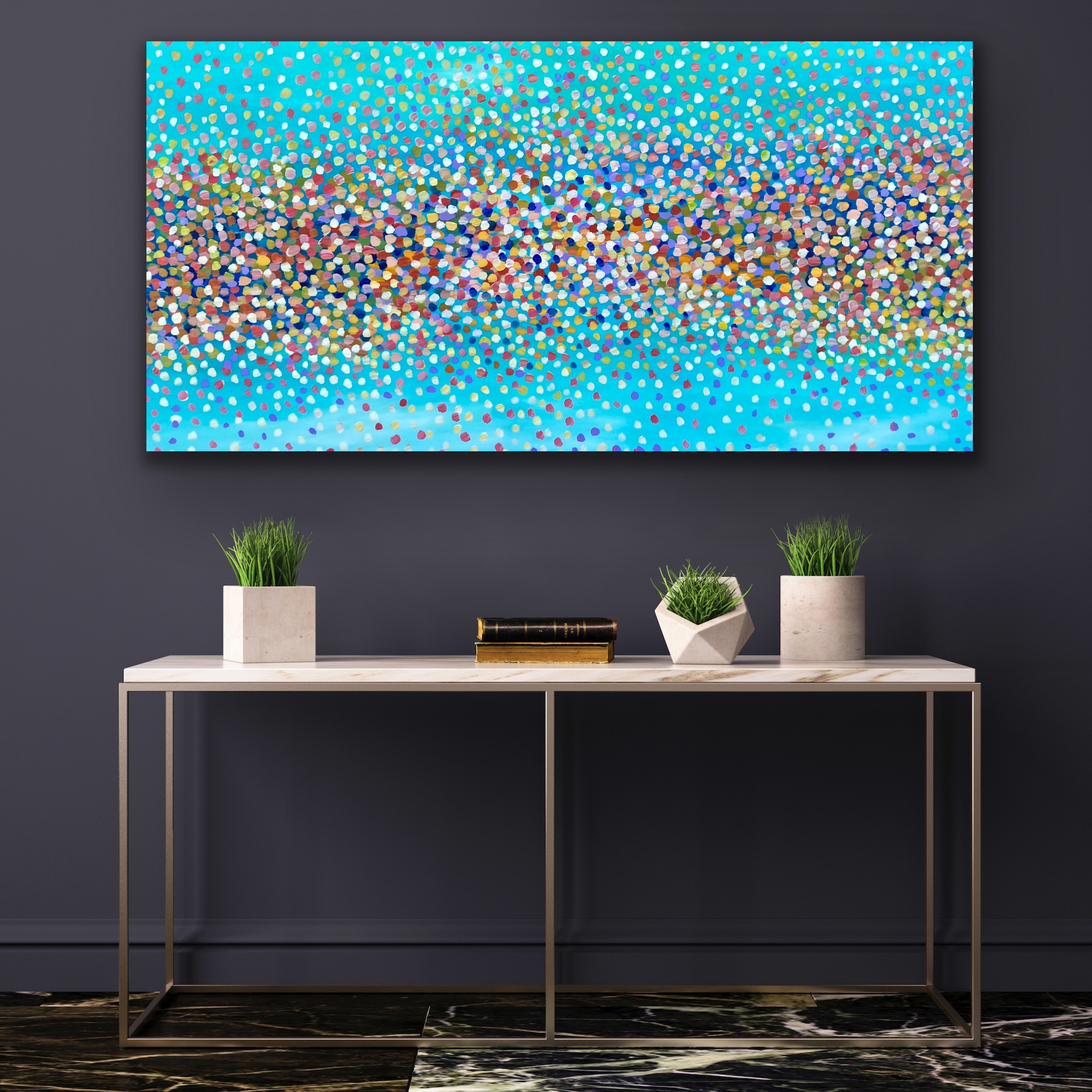 Sacred Love by Theo Papathomas a beautiful rainbow of petals in the sky falling onto the landscape creating an electric explosion of petals. Fireworks of petals in the sky like musical notes dancing to their own song against the beautiful blue sky. Hope with this work it makes the viewer feel very peaceful and tranquil. I tried to create so much depth in the painting and filling the Sky with petals like shooting stars. The painting is signed and dated 2021 at the back and comes with a certificate of authenticity.