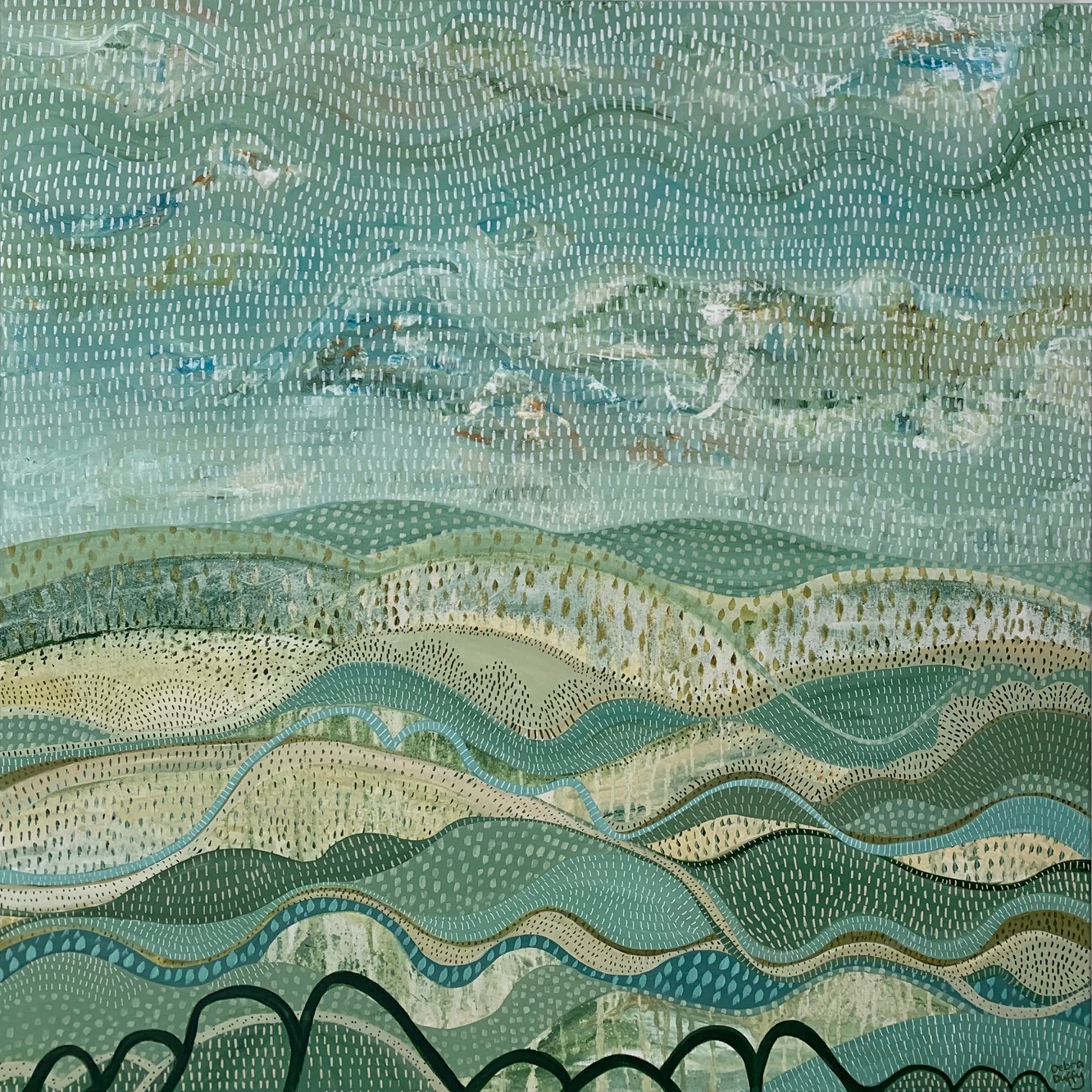 This artwork is an original abstract using acrylic paint and artist markers. My inspiration was to create an energetic and lively abstract landscape with lots of detailed areas weaving throughout using contrasting textures of patterns and flowing gestural moments. The use of green hues such as sage, green gold and a bold forest green colours paired alongside with warm yellow ochre and tan colours creates an earthy combination.