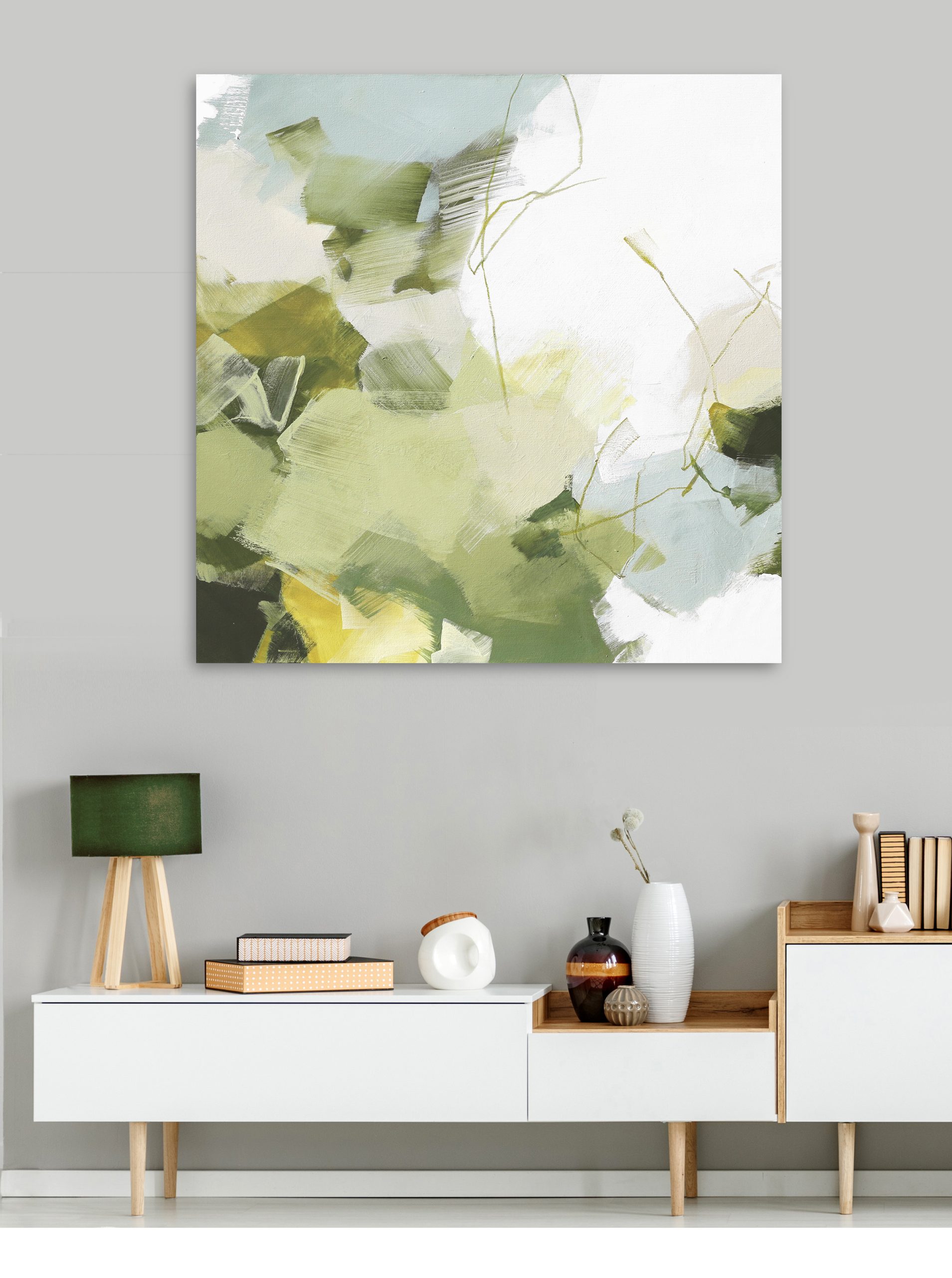 Sage is a combination of olive, greens, yellow, blue greys and mustard. She is painted on quality stretched canvas and has painted 3.8cm sides so she’s ready to hang.