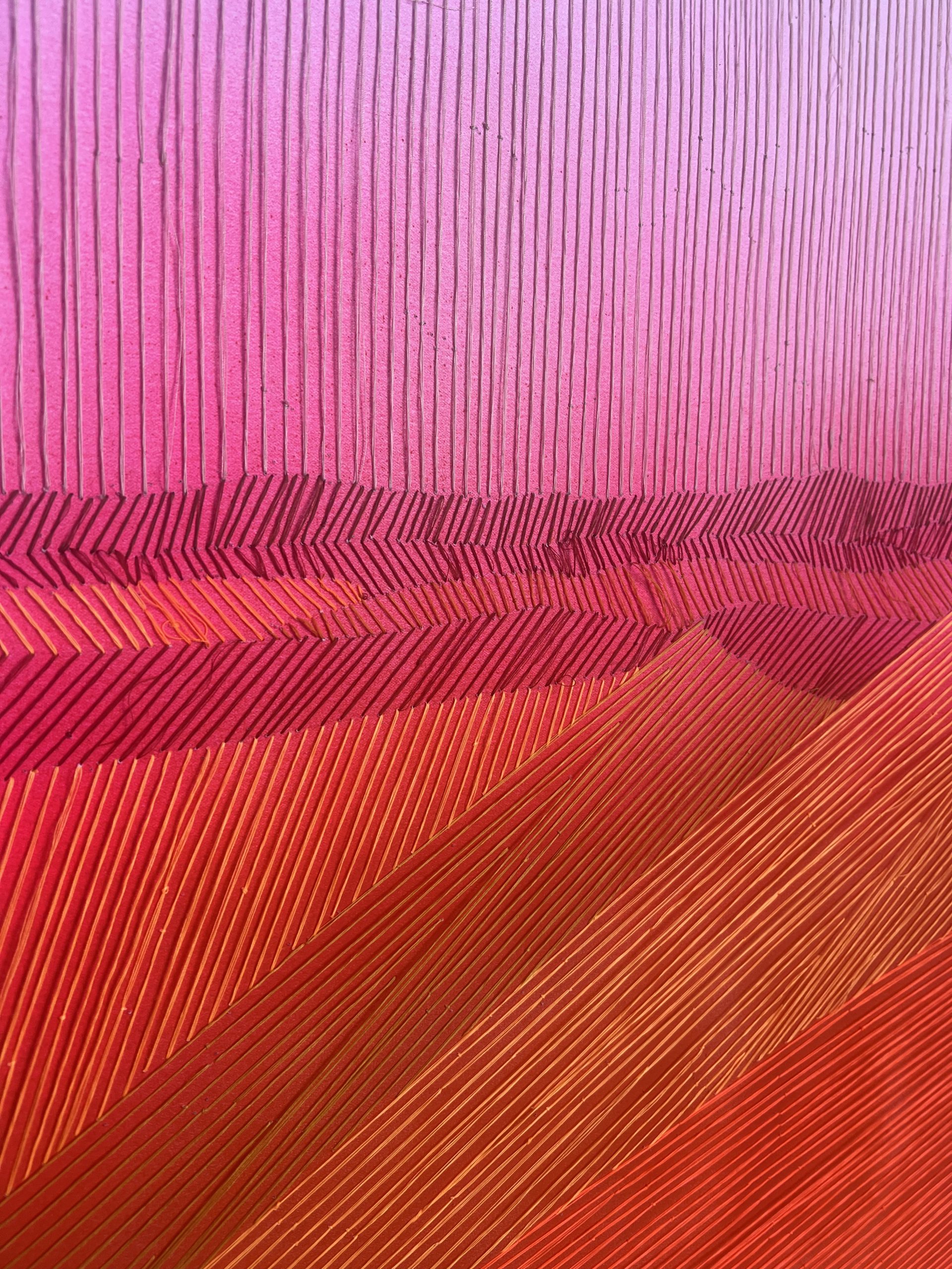 This artwork of the Sahara Desert captures the essence of its vast, shifting sands through the dynamic use of spray paint and a combination of rough and neat hand-stitched thread. The spray paint evoke the sweeping motion of the desert winds and the fluidity of the dunes, creating a visually immersive experience.