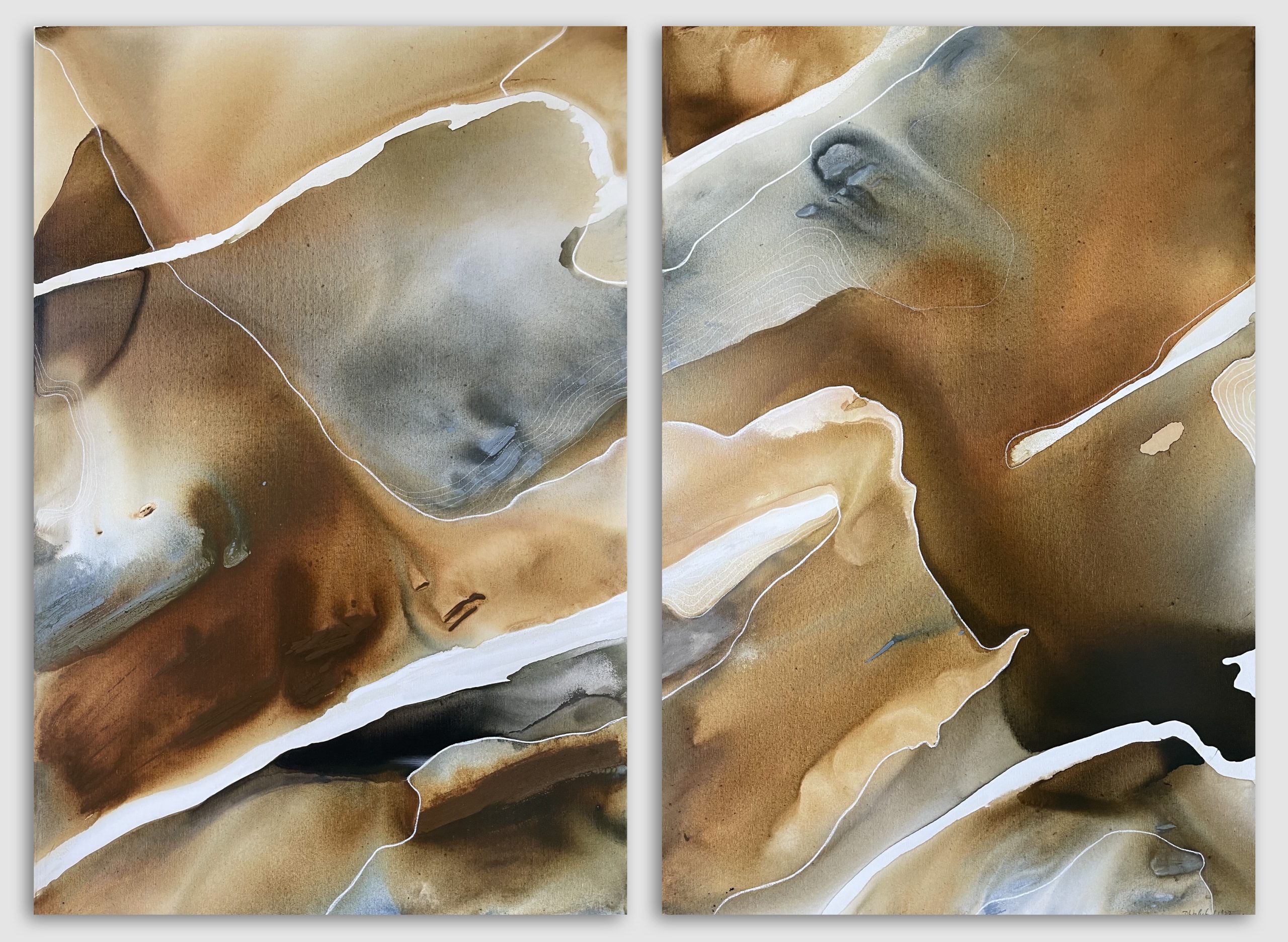 Sahara (diptych) by Dinah Wakefield is inspired by the light, the colours and the natural beauty of the Noosa region of Australia. “What I love most about Noosa is the interplay of light. From the oceans to the clouds, to the river estuaries and the hinterland, this canvas unfolds before me every day and finds expression in my paintings”.