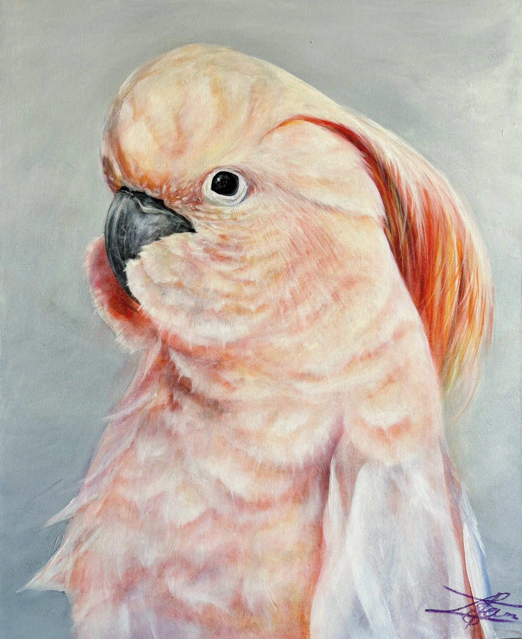 Salmon Crested Cockatoo by Chad Stevens – This artwork showcases the delicate beauty of the Salmon-Crested Cockatoo, also known as the Moluccan Cockatoo. Its soft, blush-hued plumage, bold black beak, and striking crest create a stunning contrast, highlighting the bird’s elegance and charm. A true representation of grace, this piece celebrates the unique allure of this remarkable species.