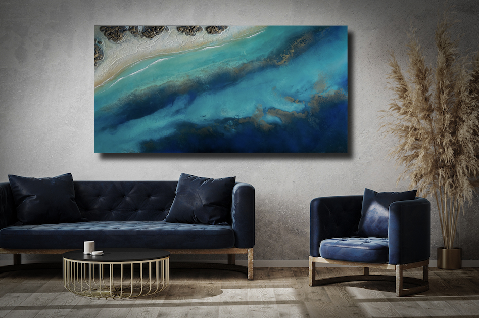 Resin Painting “Salt and Stone” by Petra Meikle is a striking 200 x 100 cm resin and mixed media aerial seascape capturing the moment where land meets deep water. Inspired by Australia’s rugged reef zones and tidal energy, this piece evokes the feeling of flying above a coastline — looking down as currents curl onto sandbanks and textured rock shelves break through the surface.