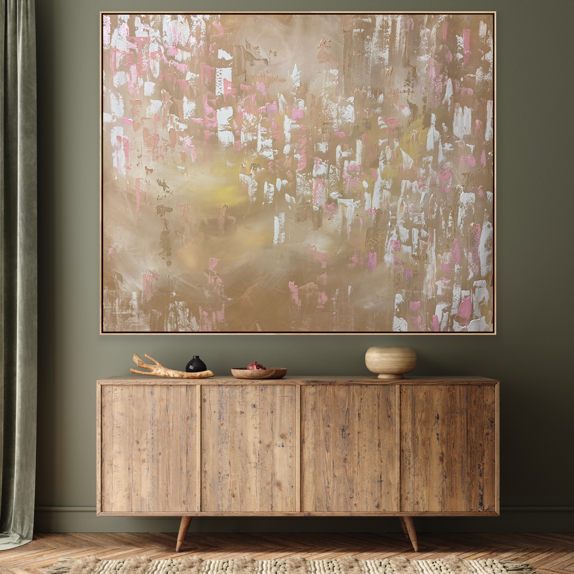 This richly textured abstract painting evokes the warmth of a seaside morning, where golden sands meet the gentle shimmer of salt air. Blush pinks, soft whites and sun-baked taupes are layered with intention, reflecting light like salt crystals caught in sunlight. Every brushstroke carries a memory of weathered shores, grounding the viewer in peace, joy and a sense of place.