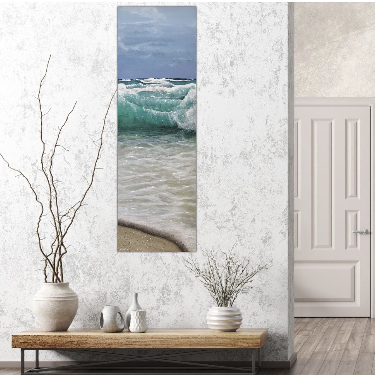 This piece of art will definitely capture the attention of all who gaze upon it. This beach setting will suite any contemporary home perfectly, wherever it be hung.