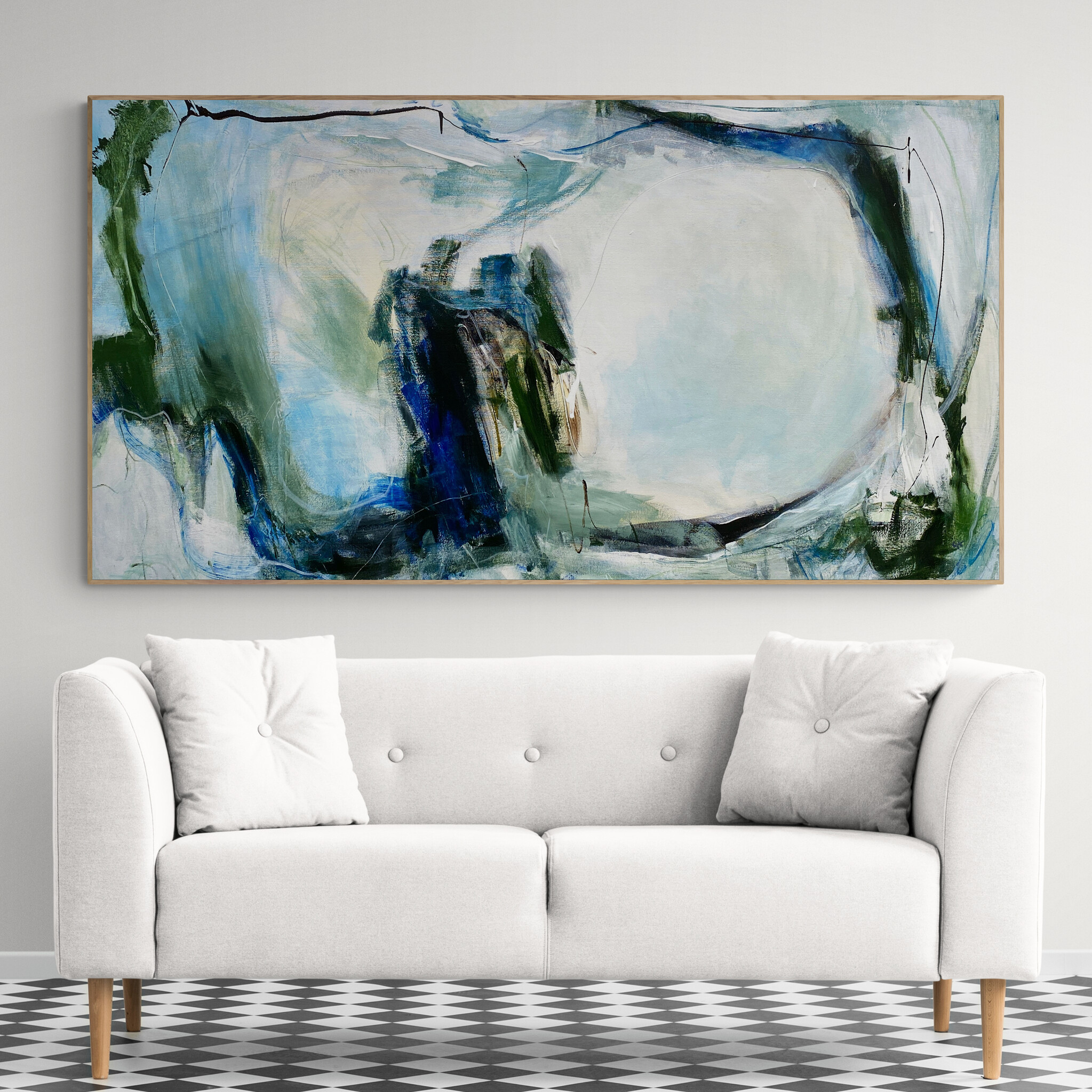 This captivating artwork is made all the more intriguing by the bold and intuitive mark-making and striking palette combination of blue and deep green hues set against bold marks in dark olive, brown, beige, white and neutral tones. It really is a fantastic statement piece that would pop in any large space.