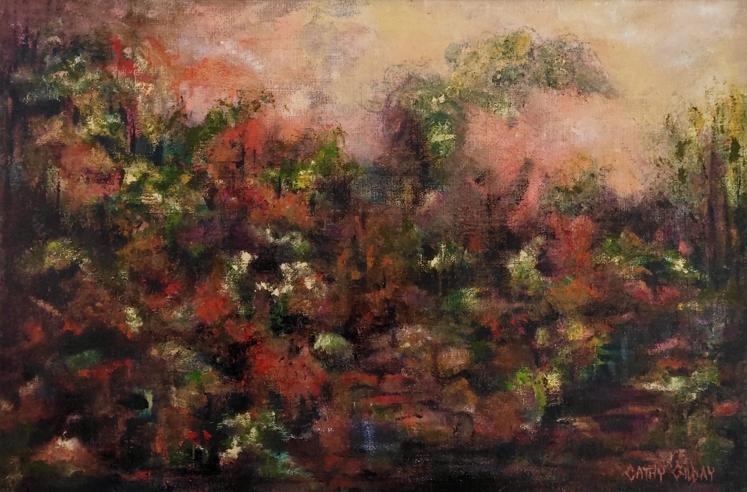 Sanctuary by Cathy Gilday – This rustic, softly lit impressionistic Australian landscape‚ was painted on a hessian covered board. This technique enhances texture, achieving a tapestry like effect and adding a beautiful “old world” charm. It required layers and layers of paint, as it is rapidly absorbed by the open weave. I used Atelier artists acrylic and the painting has been sealed with a UV protection. Professionally framed and ready to hang. Framed work measures 97.5cm x 67.5cm x 3cm.