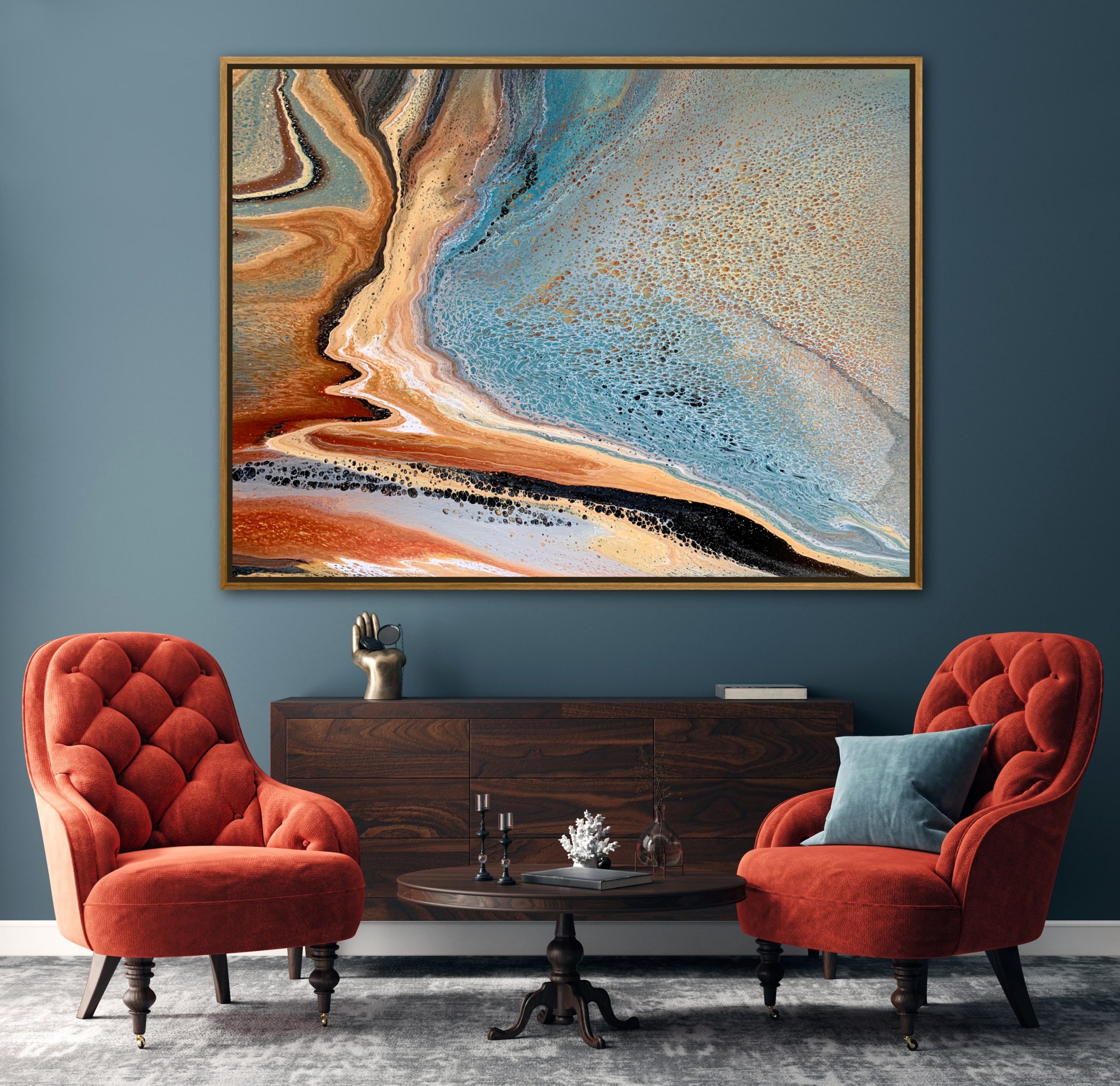 Sand and Sea was created using various techniques combined to allow increased flow, interaction and separation of colours to create interesting patterns where pops of colour can be seen emerging from underneath. This added dimension adds lace and cells to the artwork creating an interesting and one of a kind painting that can never be replicated. A lovely variety acrylic pigments were used including metallic yellow & rose gold, bronze, copper, silver, grey, cream, black, blue, green and white.