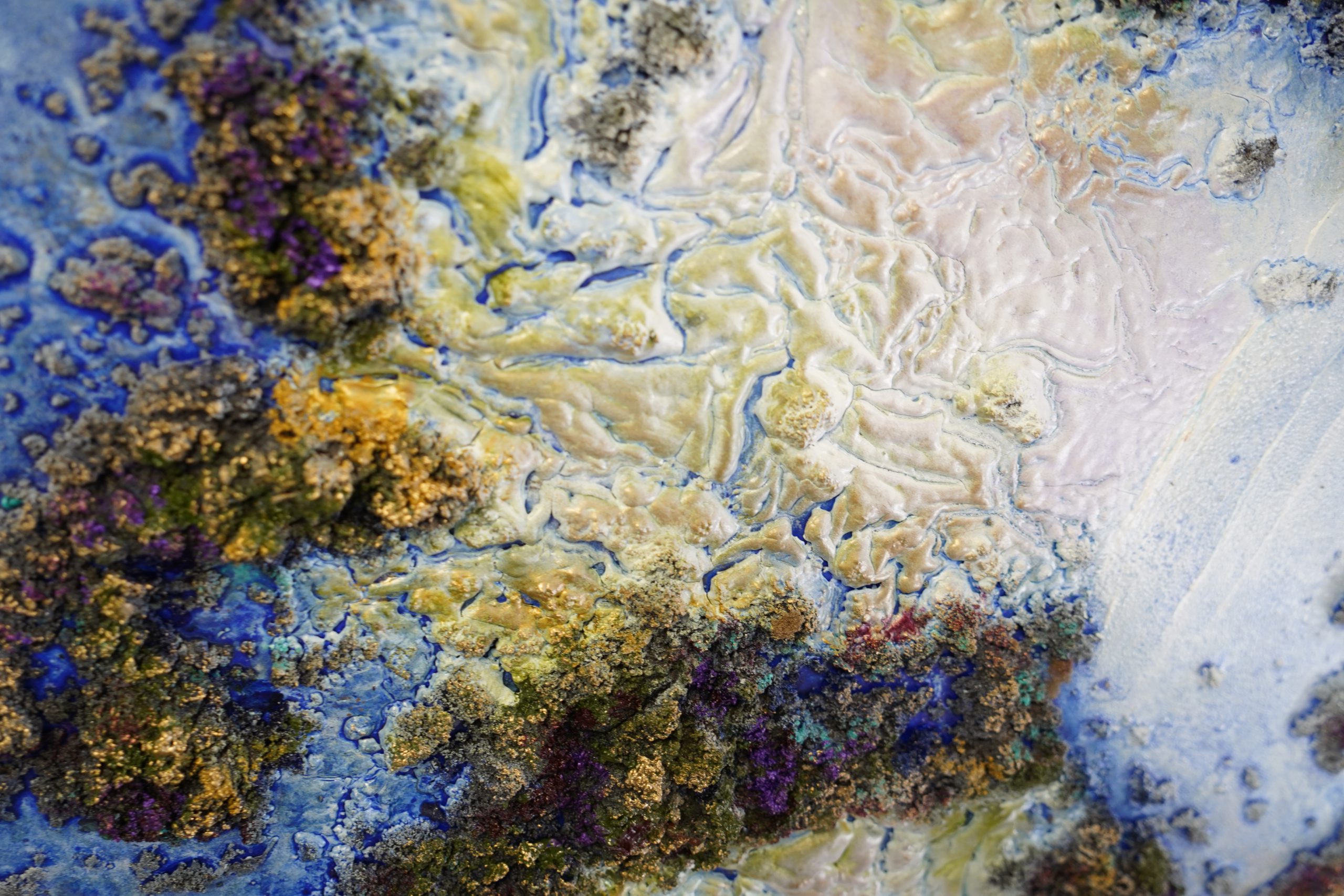 This is an extremely textured, 3 dimensional painting. The metallic paints light up differently with the various angles the light may come on it during the day from morning to dark and then under the lights at night.