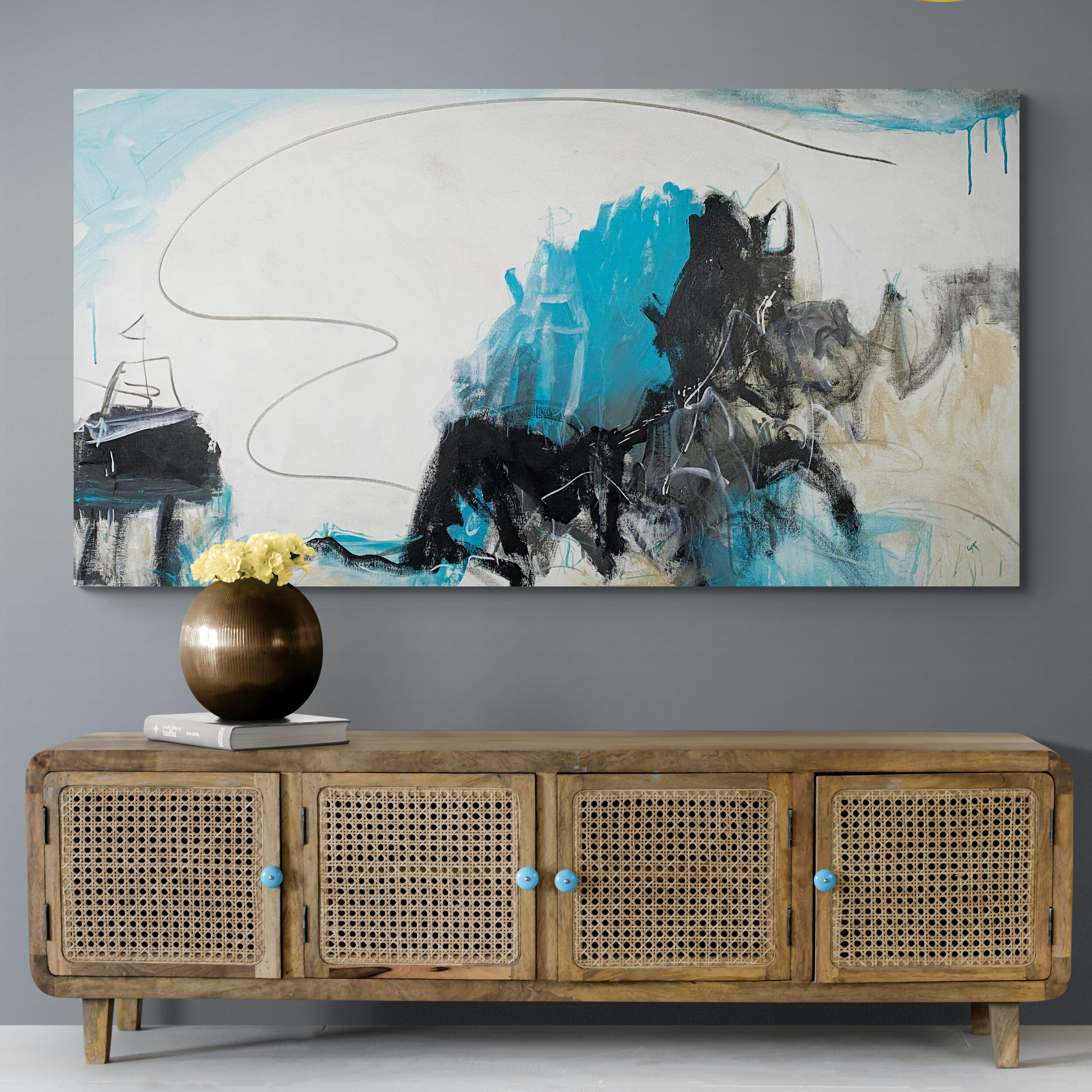Its vibrant palette of light blue, grey, black and white combined with a hint of warm sandy beige makes the bold expressionist mark-making come alive.