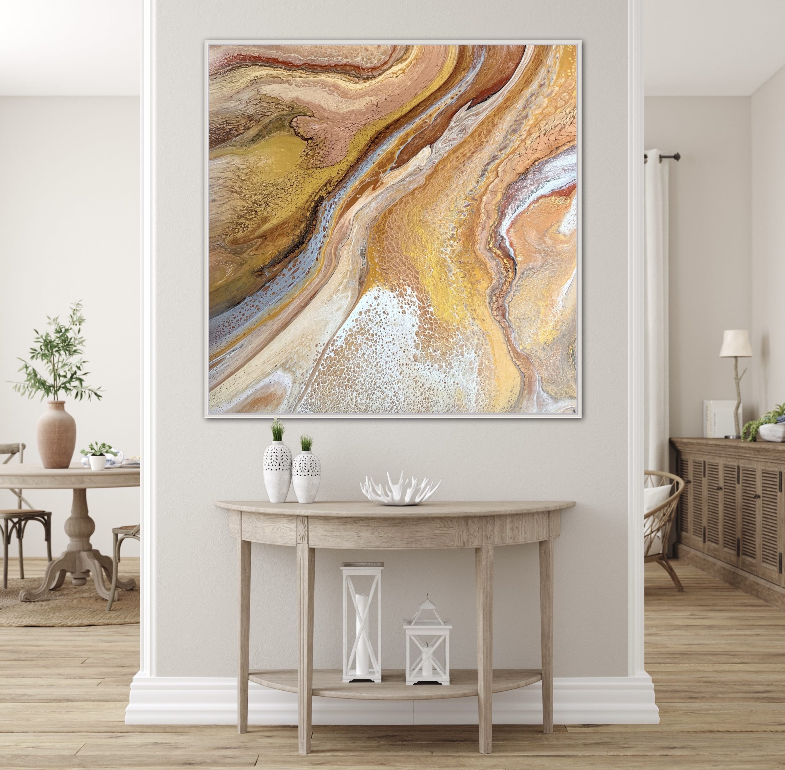Sands Combined was created using various techniques combined to allow increased flow, interaction and separation of colours to create interesting patterns where pops of colour can be seen emerging from underneath. This added dimension adds lace and cells to the artwork creating an interesting and one of a kind painting that can never be replicated. A lovely variety acrylic pigments were used including metallic yellow & rose gold, bronze, copper, silver, grey, cream, black and white.
