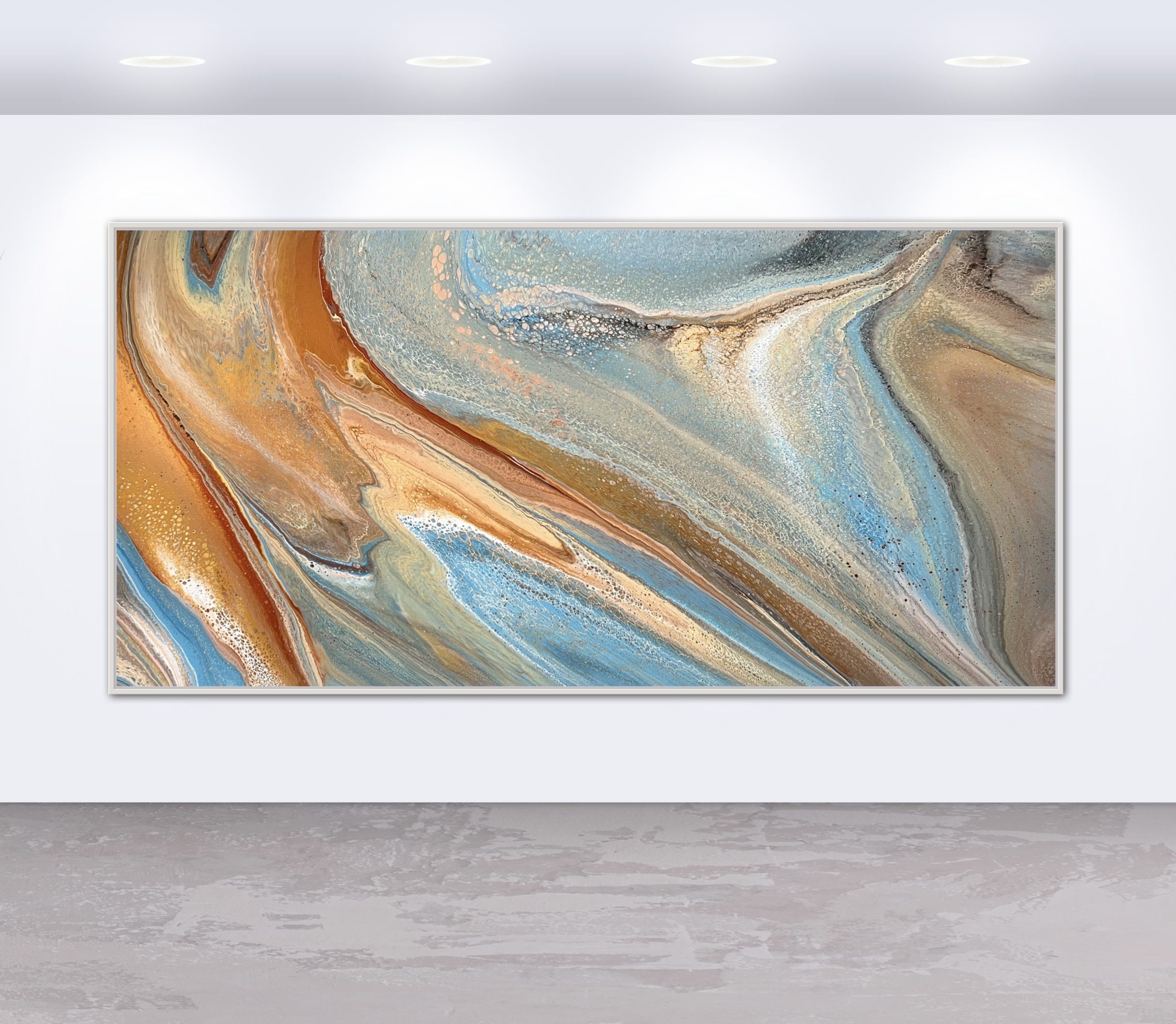 Sandy Bay was created using various techniques combined to allow increased flow, interaction and separation of colours to create interesting patterns where pops of colour can be seen emerging from underneath. This added dimension adds lace and cells to the artwork creating an interesting and one of a kind painting that can never be replicated. A gorgeous variety acrylic pigments were used including metallic yellow & rose gold, bronze, copper, silver, cream, brown, grey, blues, green, black and white.