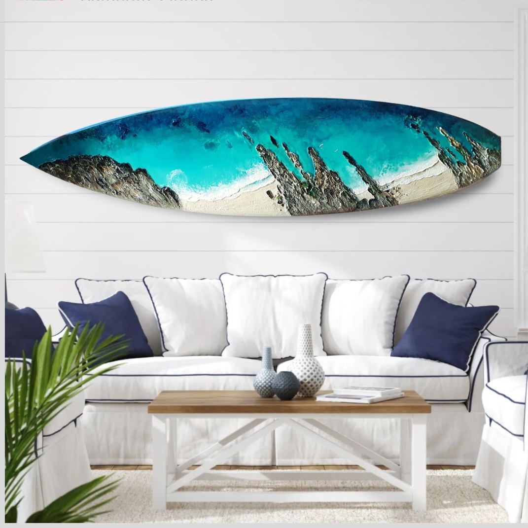 This original ocean resin artwork showcases the beauty of the ocean water and crashing waves. This artwork was created on a pre-loved surfboard using professional grade resin, resin pigments, alcohol inks, acrylic paint, real beach sand & textured paste.