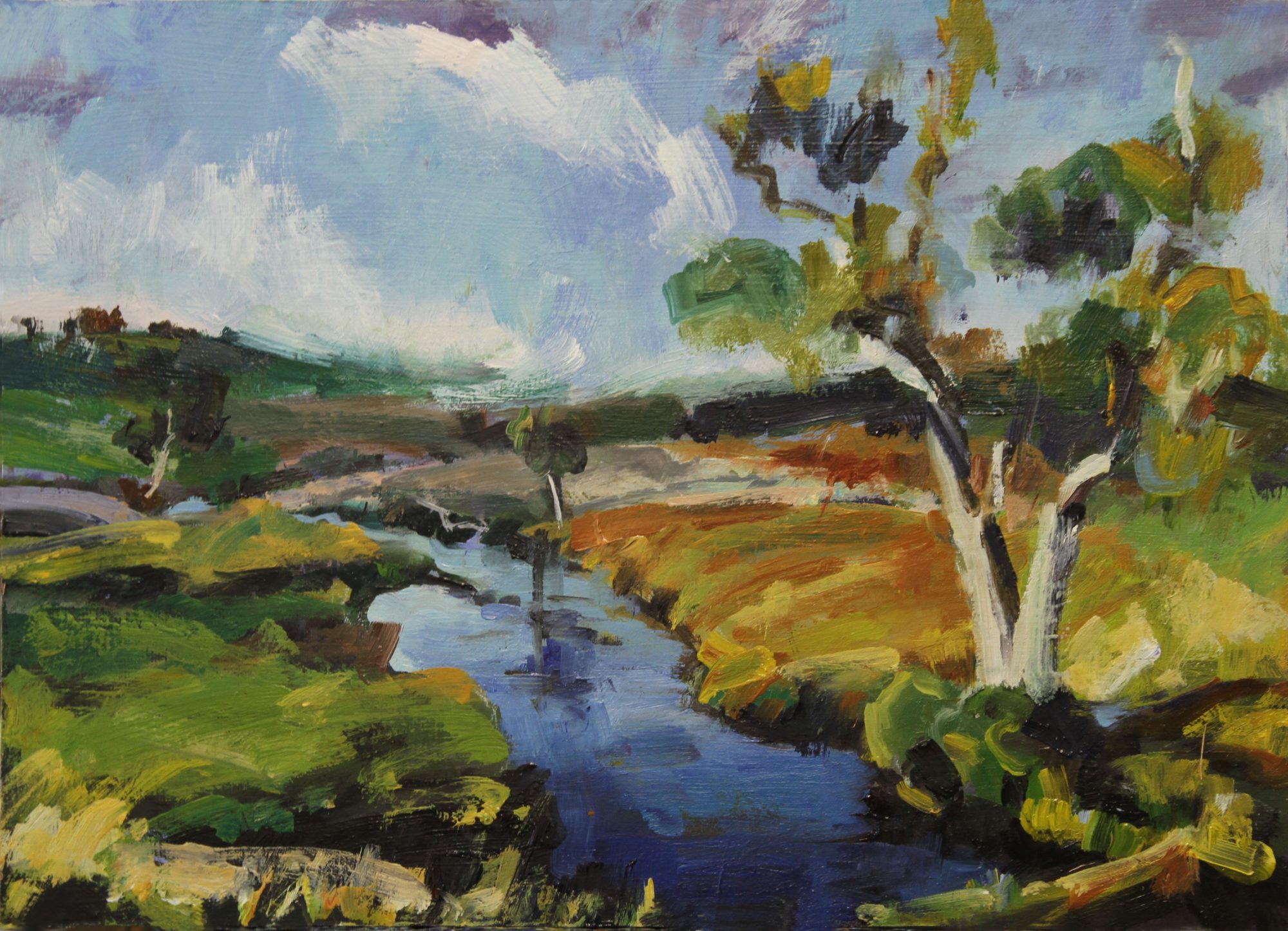 Afternoon light on the Dorrigo landscape is something to behold. The vast pastures of green and slashes of yellow/gold are just electric. In fact the colours almost look manufactured as if they are scenes out of Telly Tubby Land. So when the occasional creek meanders into the scene the blues coupled with reflective light really pop. It is such a joyous site to behold and one cannot help but come away in feeling totally uplifted. This work is painted in a loose Impressionist style in oils on board.