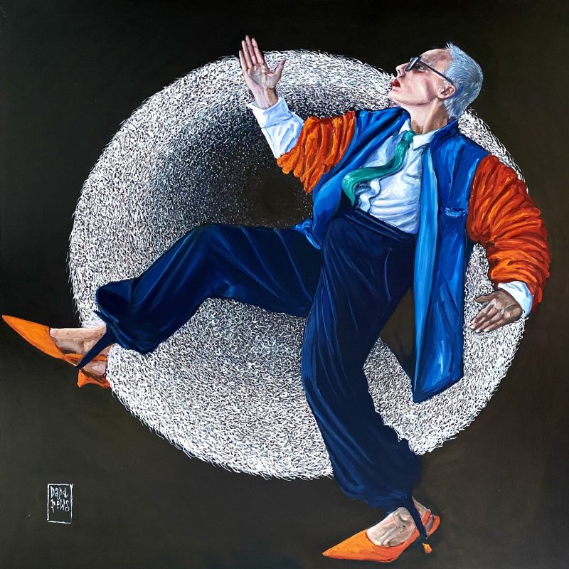 In this lustful painting, a man is seen raising his lover. Arms reach out and up pulling the others body in tighter. Their faces lock allowing for a passionate kiss that is etched in ones memory for the rest of time.