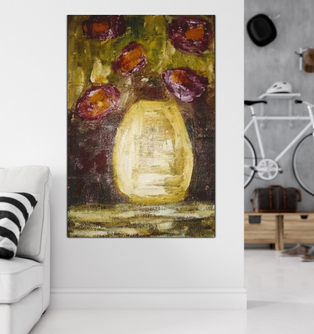 Acrylic floral painting. Abstract soft flowers in a yellow vase on dark textured background.