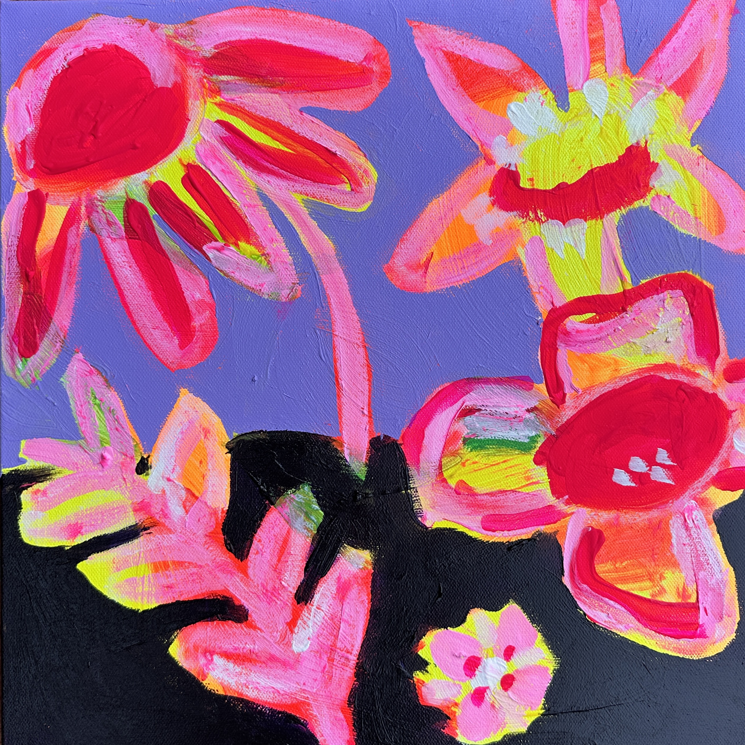 A lively explosion of bold blooms and playful energy, Sassy Stems 1 is a celebration of colour and confidence. The textured neon petals dance across a rich black foreground, with glowing pinks, yellows, and orange contrasted by a dreamy lilac sky. This piece exudes attitude, with its exaggerated flower forms and joyful, carefree spirit. A floral statement for any space needing a pop of sass.