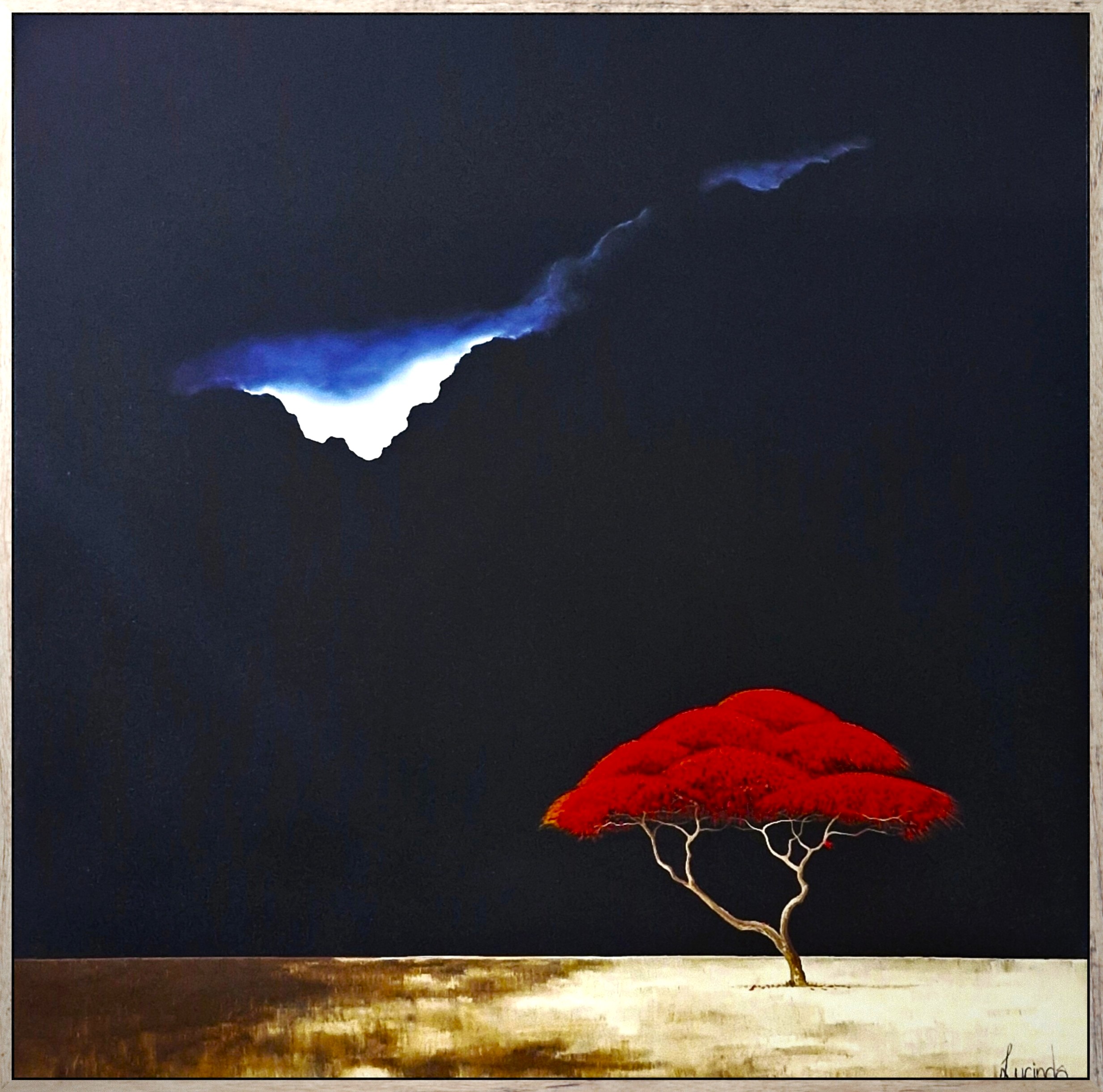 Savanna Nights : This square canvas, 100 cm a side and held in a warm oak floating frame, portrays the African savanna under the cloak of night. The centerpiece is a striking red acacia tree, standing alone in a sea of dry, sun-faded grass. The darkened sky above and the pale plains below create a serene tension, while the vivid tree blazes with life and energy. Savanna Nights – Grasslands invites the viewer into a moment of still solitude on a vast and untamed landscape.