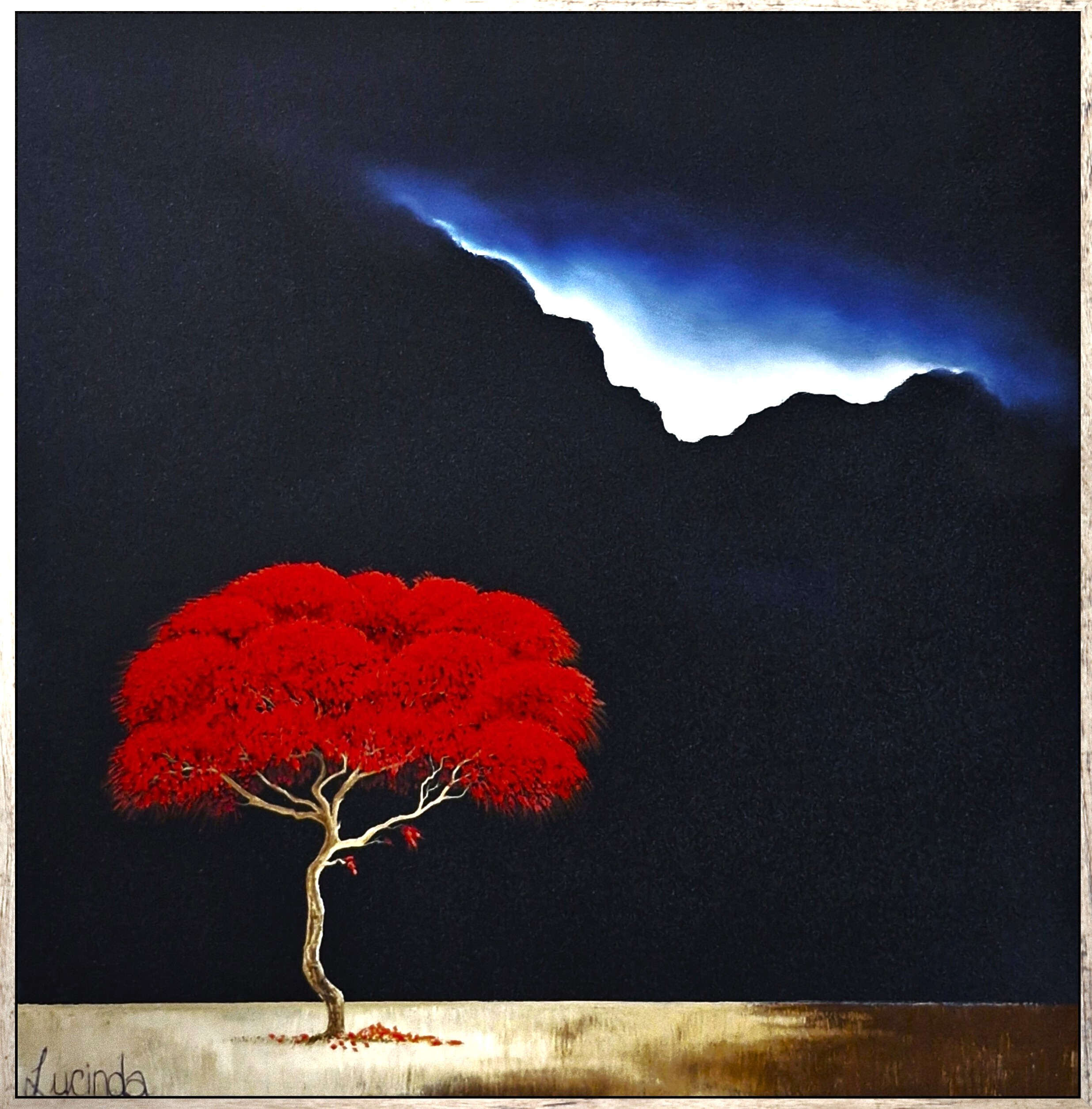 Savanna Sentinel : This small square canvas, 50 cm a side and held in a warm oak floating frame, portrays the African savanna just before the dawn. The centerpiece is a striking red acacia tree, standing alone in a sea of dry, sun-faded grass. The darkened sky above and the pale plains below create a serene tension, while the vivid tree blazes with life and energy. Savanna Sentinel invites the viewer into a moment of still solitude on a vast and untamed landscape.