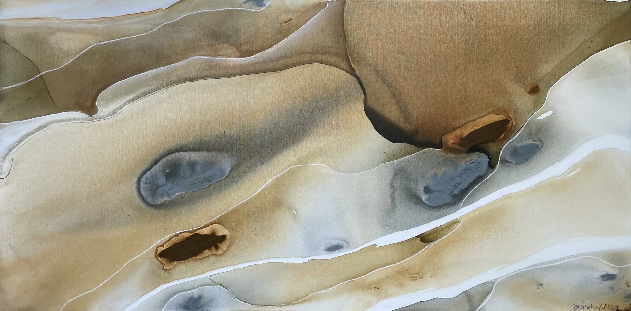 Savannah by Dinah Wakefield is inspired by the light, the colours and the natural beauty of the Noosa region of Australia. “What I love most about Noosa is the interplay of light. From the oceans to the clouds, to the river estuaries and the hinterland, this canvas unfolds before me every day and finds expression in my paintings”.