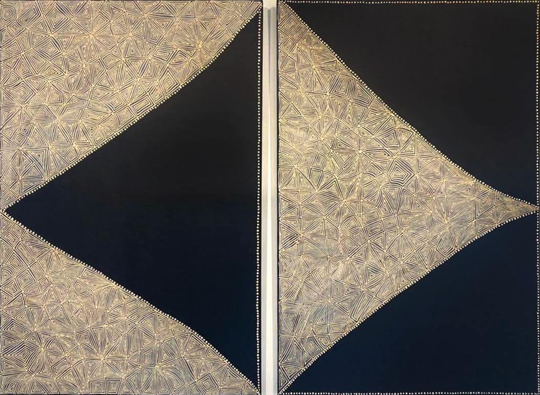 A diptych painting, they will form a mirror image diamond shape to represent tree carvings. An ochre wash is applied on top of the pattern to convey that these special sites designs, are forever walked upon in the past, present and future