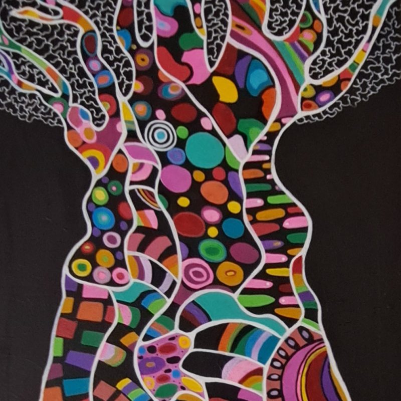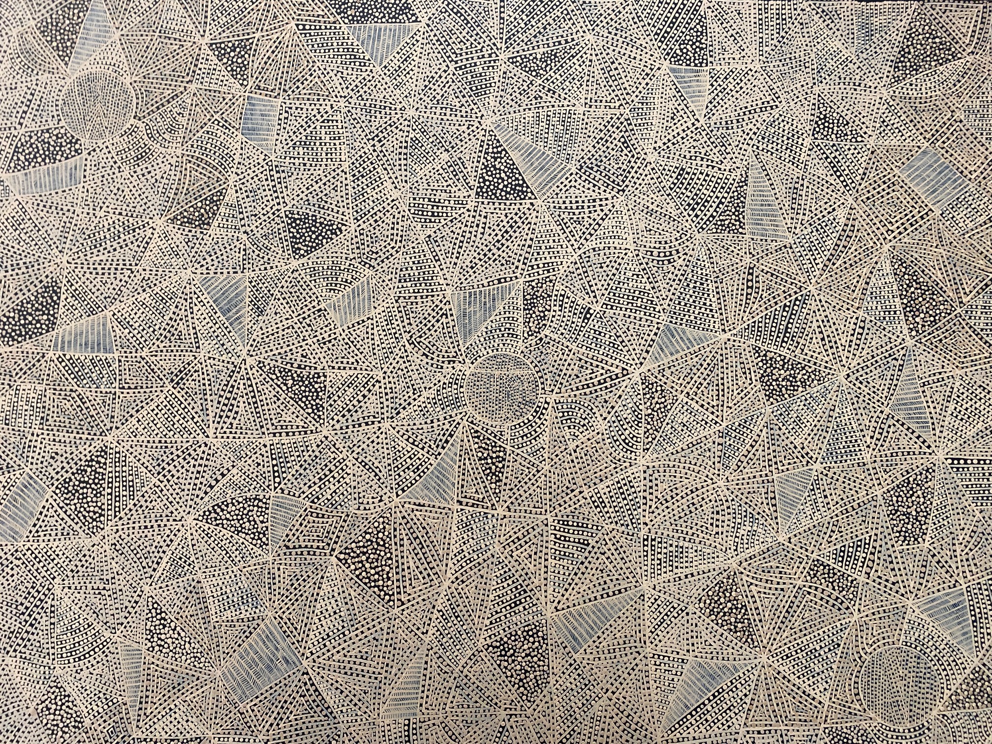 Scar Tree Country by Cara Shields – On Wiradjuri and Wangaibon Country, tree carving and bark removal was common. The Stylized lines and dots represent my interpretation of regrowth lines from bark removal while also incorporating design elements of the deep carving lines.