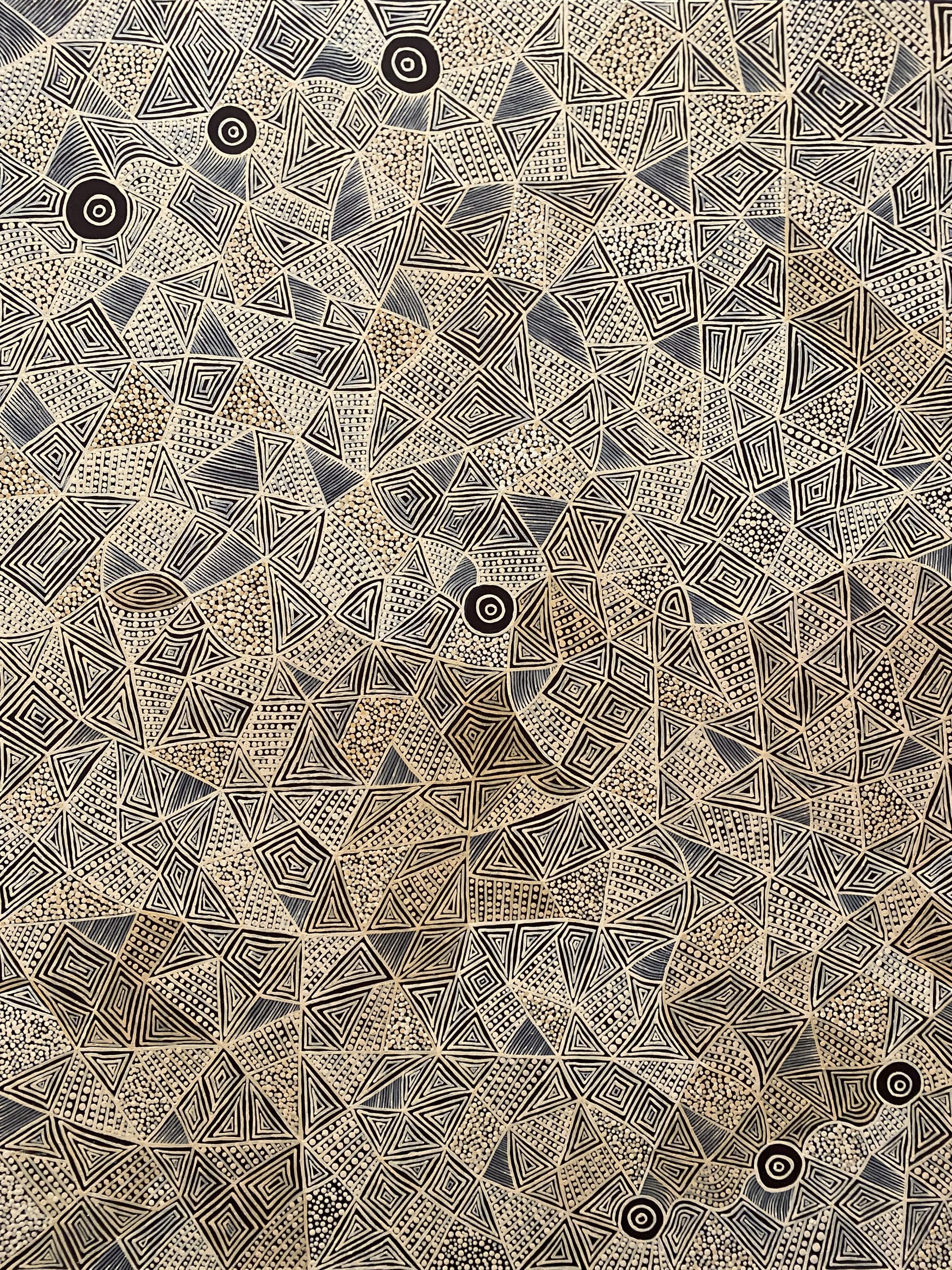 Scar Tree Country – Home by Cara Shields – On Wiradjuri and Wangaibon Country, tree carving and bark removal was common. The Stylized lines and dots represent my interpretation of regrowth lines from bark removal while also incorporating design elements of the deep carving lines.