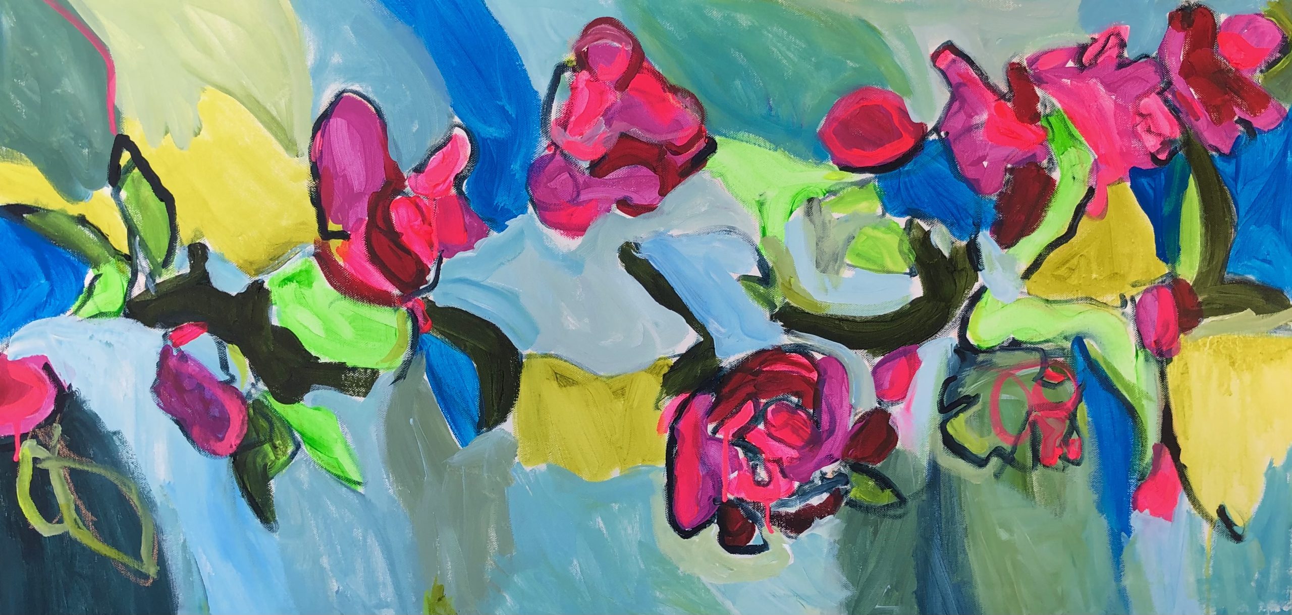 Scarlet by Carmel Reilly – Original acrylic painting inspired by a bright red hibiscus blooming and reaching across the front verandah early in the morning. Signed on the back.