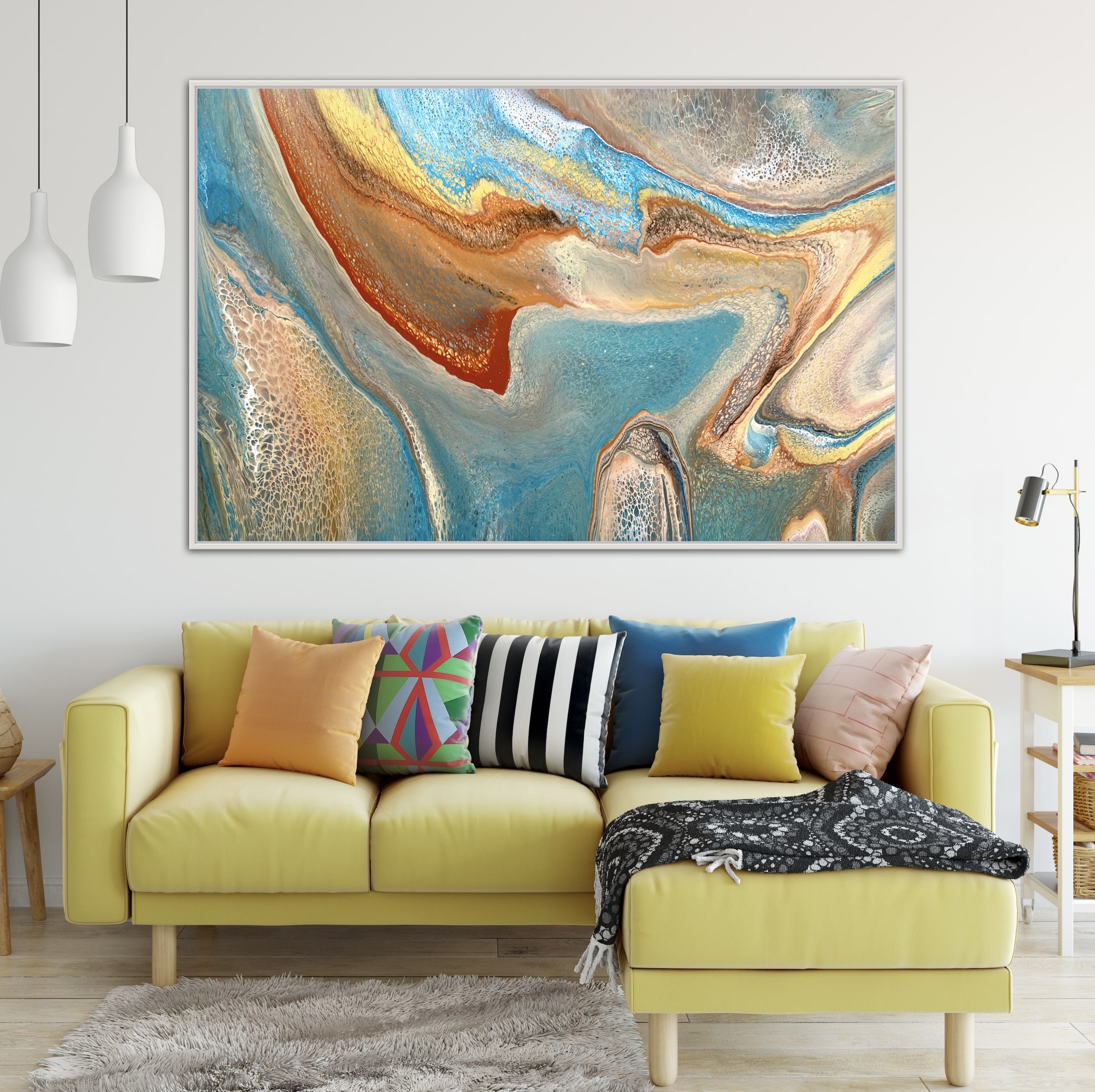 Scenic Bay was created using various techniques combined to allow increased flow, interaction and separation of colours to create interesting patterns where pops of colour can be seen emerging from underneath. This added dimension adds lace and cells to the artwork creating an interesting and one of a kind painting that can never be replicated. A gorgeous variety acrylic pigments were used including metallic yellow and warm gold, cream, yellow, blues, bronze, copper, silver, grey, black, rose gold and white.