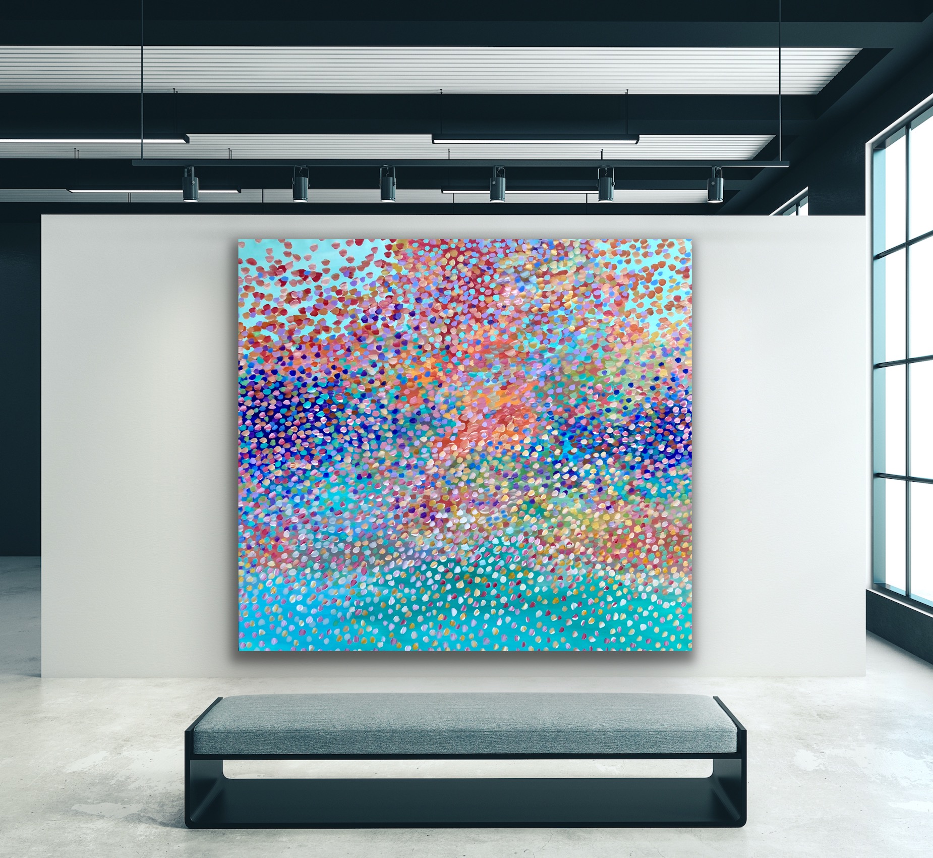 Scent of the Forest by Theo Papathomas – A painting with beautiful warm and cool colours of the trees and petals flying in the wind falling over a lake with a beautiful light blues and pinks , orange,purples. Petals weeping onto the landscape creating this beautiful veil of colours covering the whole landscape . A composition of colours and rhythms of petals dancing over the landscape like an explosion of fireworks . A very peaceful and tranquil painting with warm and cool colours with so much depth . This painting is painted on canvas.The painting is signed and dated 2021 at the back and comes with a certificate of Authenticity.