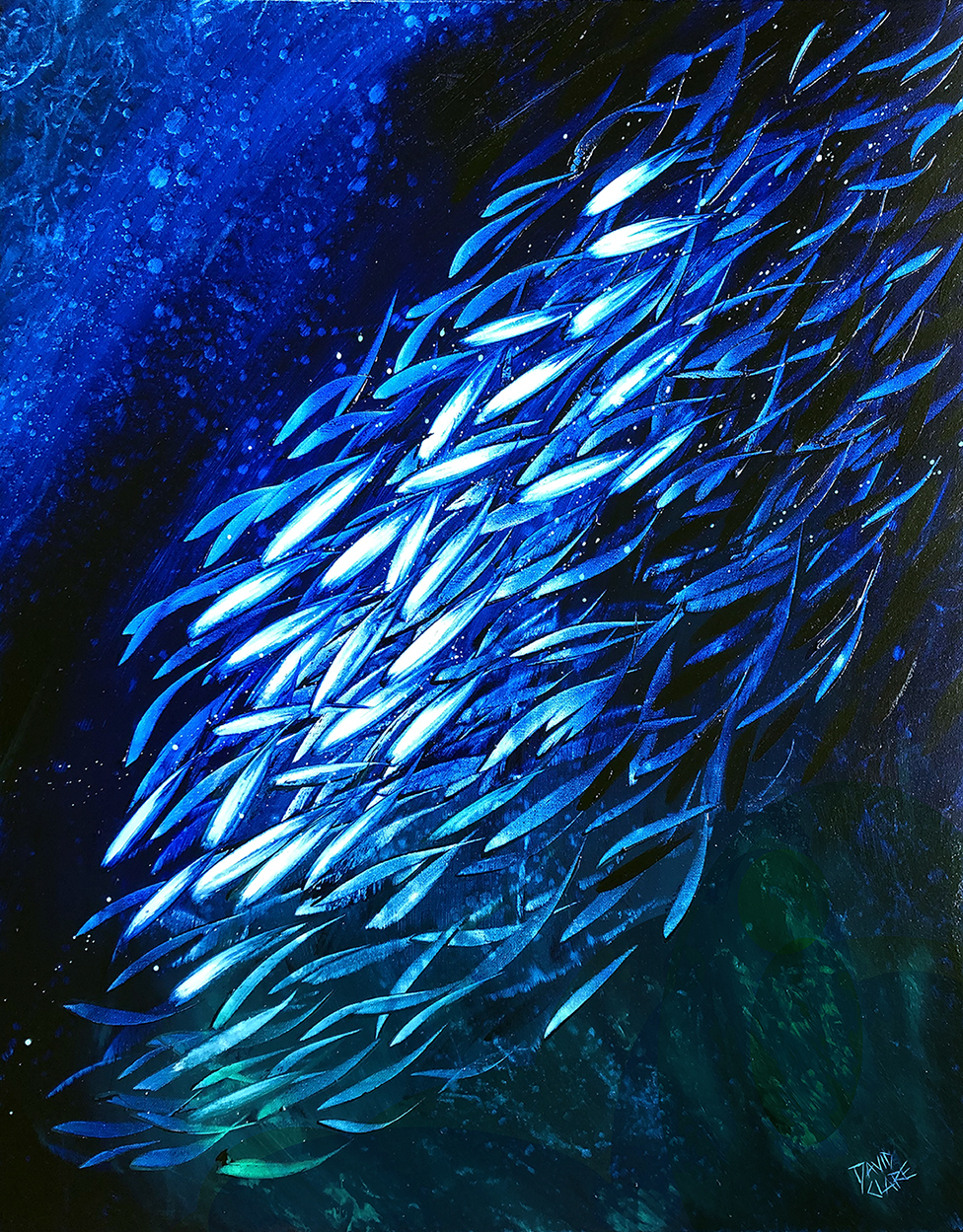 School Of Fish by David Clare – Oil painting of fish in deep blue ocean, on thick stretched canvas, ready to hang. I am constantly inspired by the colour of the ocean, and the magic of schools of fish. However I had to take a break from them recently due to “over fishing”! The break has renewed my enthusiasm for these paintings, and this is one of a fresh new series that matches the energy of the fish themselves.