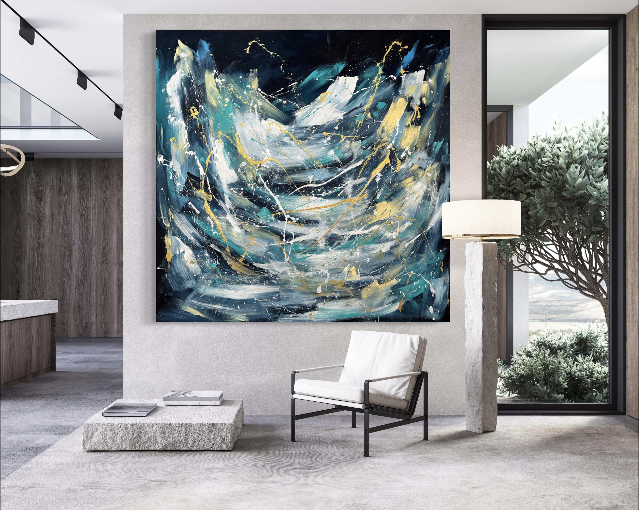 This energetic abstract has some metallic gold that changes in the light on top of the many layers of large brushstrokes and paint splatters. It appears to be an organic abstract, although the placement of colour, movement and light is intentional to create the right balance.