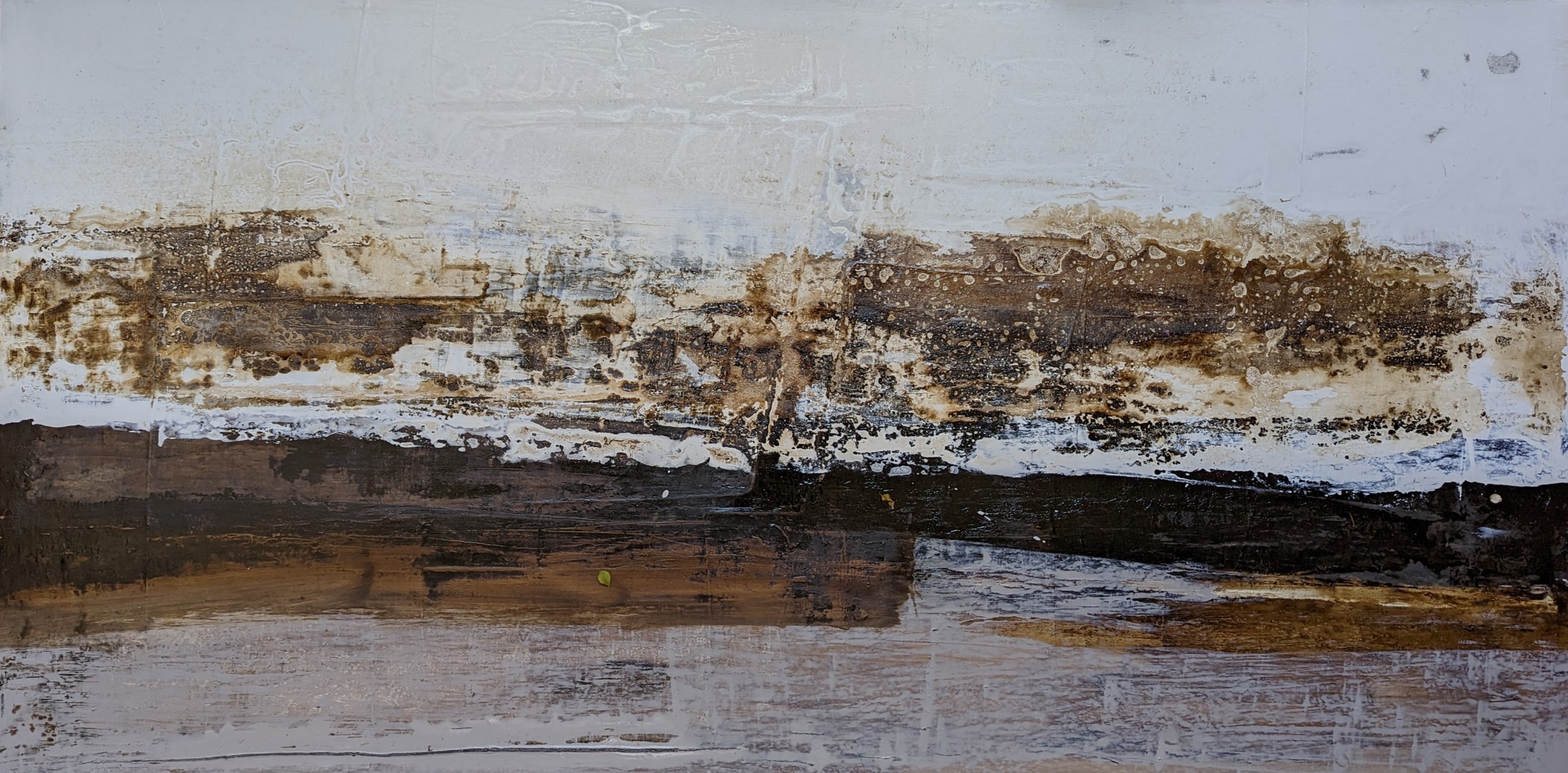 “Sea Change” is a mixed media abstract painting that incorporates various materials and textures to create a dynamic and visually stimulating composition. The color palette used in this painting is primarily comprised of brown, white, and grey tones, which blend together to create a subtle and soothing atmosphere.