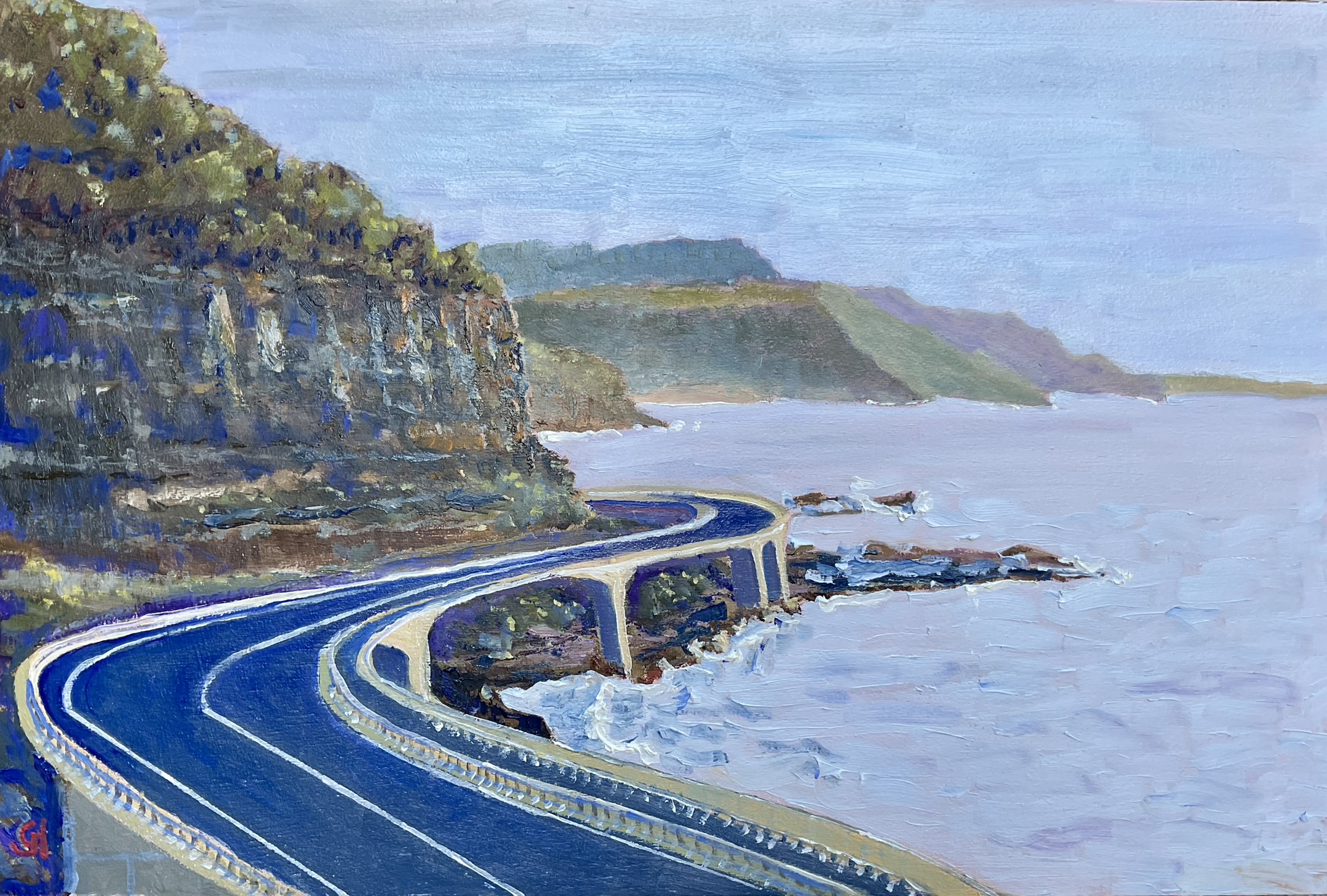 This bridge over the shoreline between Wollongong and Sydney was built because of the frequent road closures due to falling rocks. The bridge bypasses the cliff face and eliminates this problem. It is now a tourist drawcard in its own right. The Sea Cliff Bridge was named by11 yr old Makenzie Russel in a competition for local students. Â 2.1 cm sides painted white, has a wire attached to the back ready to hang. unframed.