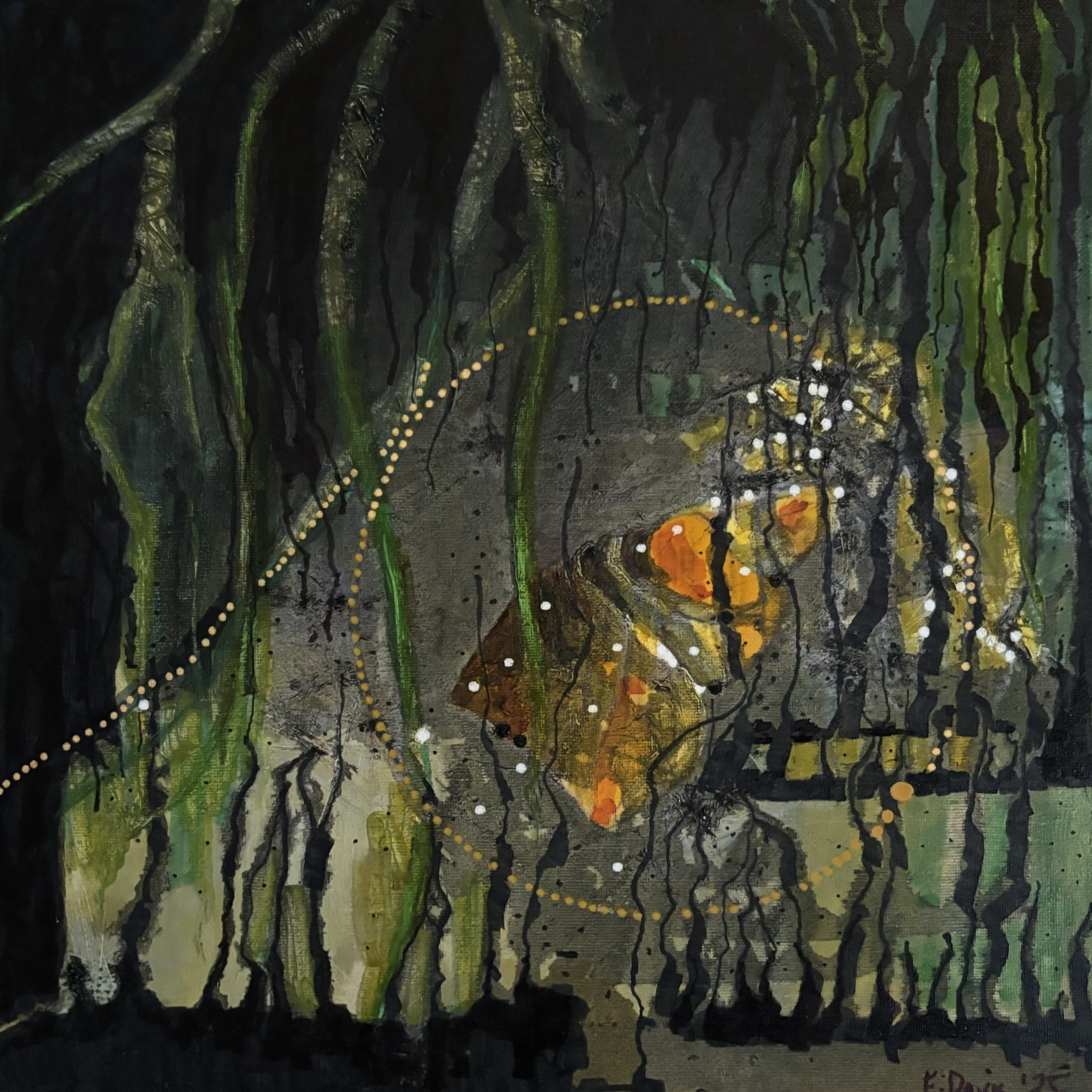 Original artwork by Erica Davis. Oil and paint pen on canvas. 35 x 35cm. Abstract underwater scene with a shell and swishing sea grass. Unframed and ready to hang