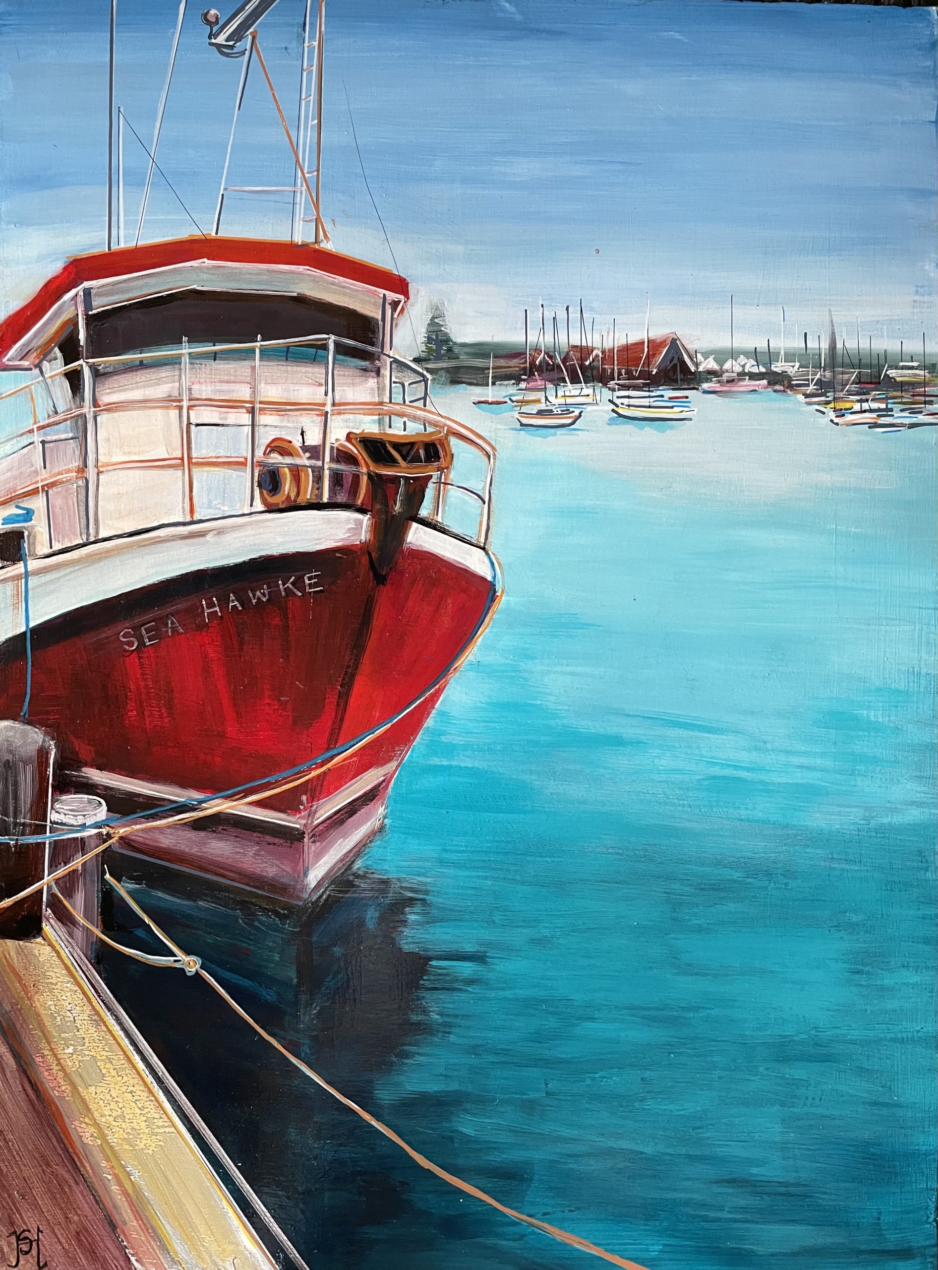 A fresh sea painting of a fishing boat with several boats and a clubhouse in the distance.  Sue was inspired to paint this seascape after a visit to a harbour in Napier, NZ.   The ropes in the foreground are there to lead the viewer’s eye further into the scene.