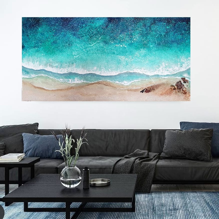 This artwork is created using a combination of textured paste, beach sand from Dee Why Beach in Sydney, acrylic paint and resin.