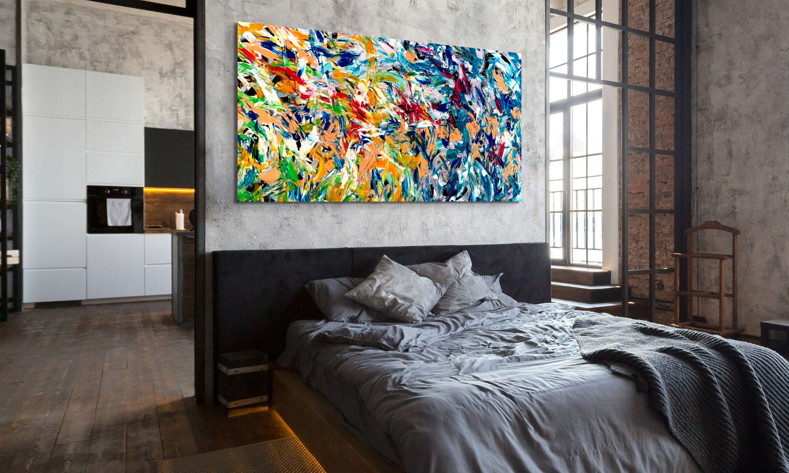 This artwork is painted on professional-grade canvas stretched and sealed with varnish. The canvas has dimensions 164 cm in width by 84 cm in height. The painting wraps around the sides of the stretcher, so the sides are painted in the same style as the surface. As such it does not need a frame.