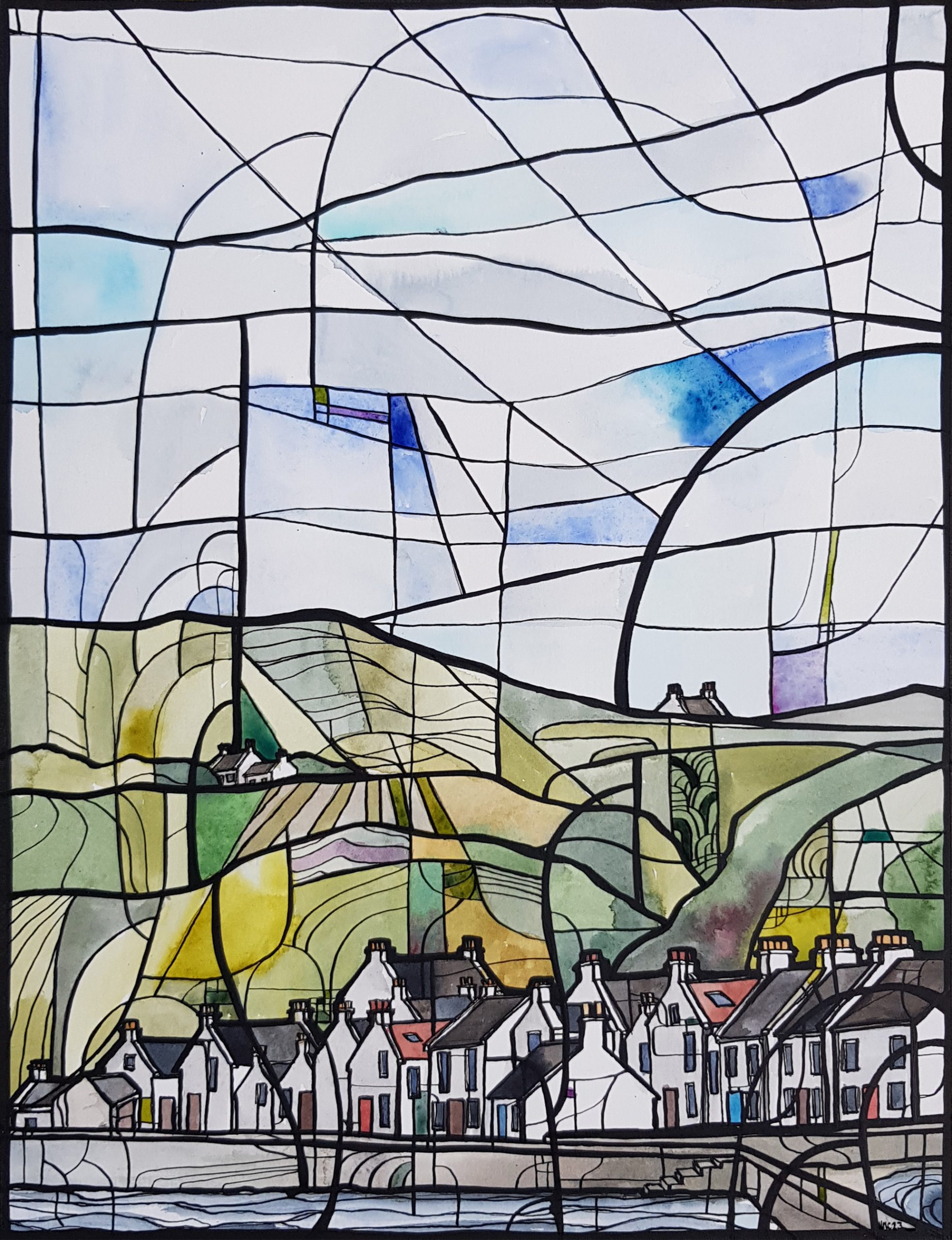 This painting is an abstract landscape depicting a coastal village. Loosely based on villages in the North of Scotland sketched during my last visit.