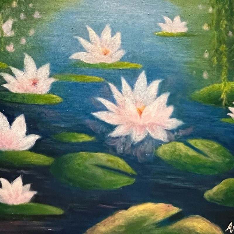 “Seagull’s Stroll” captures a serene coastal scene featuring a seagull gracefully strolling along the shoreline. Behind it, powerful waves crash, their deep green and white hues adding a sense of movement and energy to the piece. The painting balances peace and motion, highlighting the ever changing relationship between land and sea.