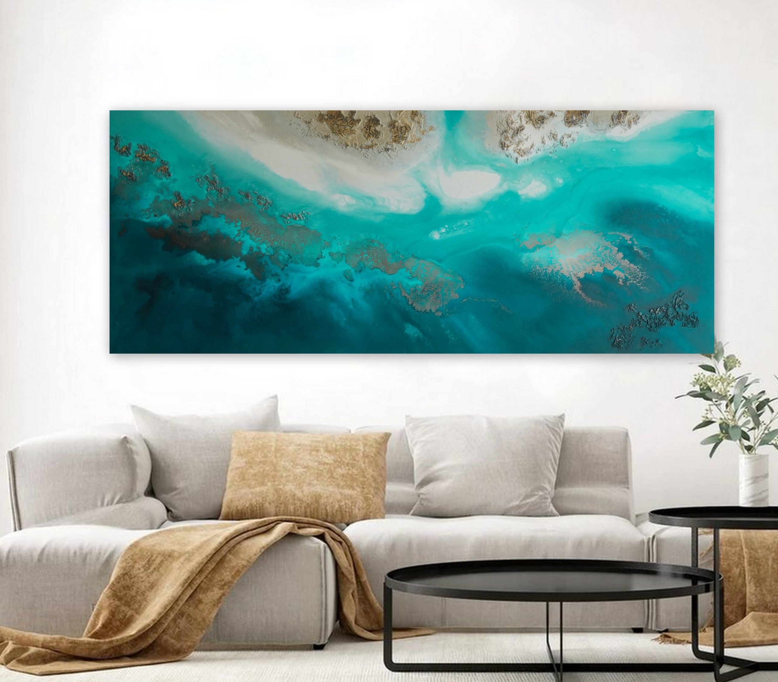 Teal Abstract Wall Art “Sea’s Melody” by Petra Meikle de Vlas – is a highly textured, 3 dimensional, abstract aerial view of the ocean.
