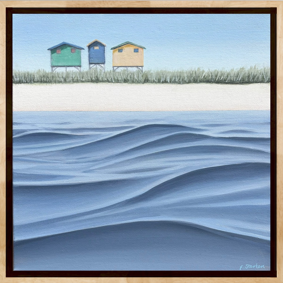 Colourful beach huts lining the beach with inky blue waves below. Modern seascape ideal for any small space.