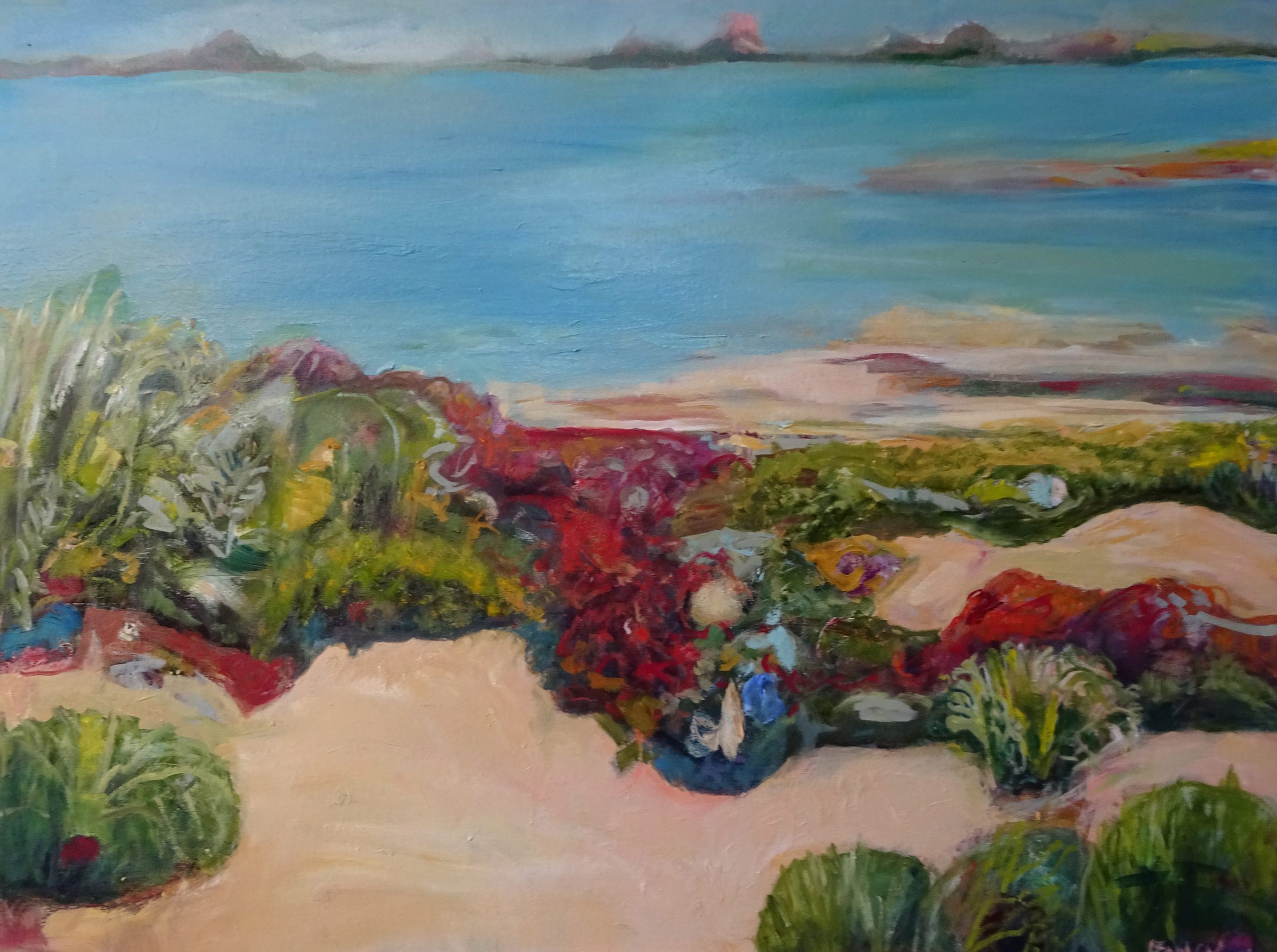 Small gauche paintings were done from the veranda of our holiday cottage, and later painted in acrylic and oils on canvas in my studio.